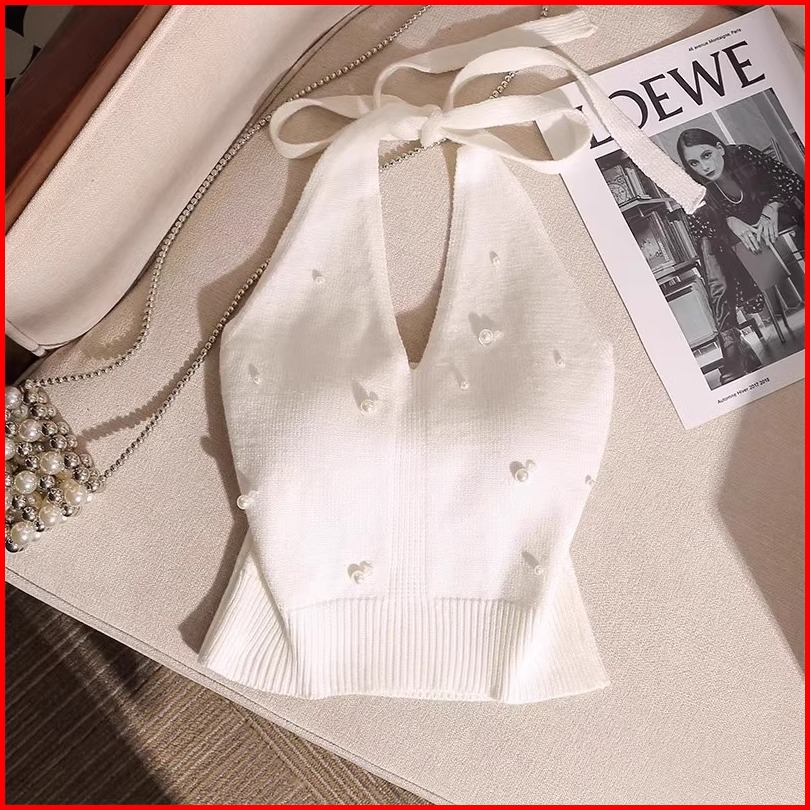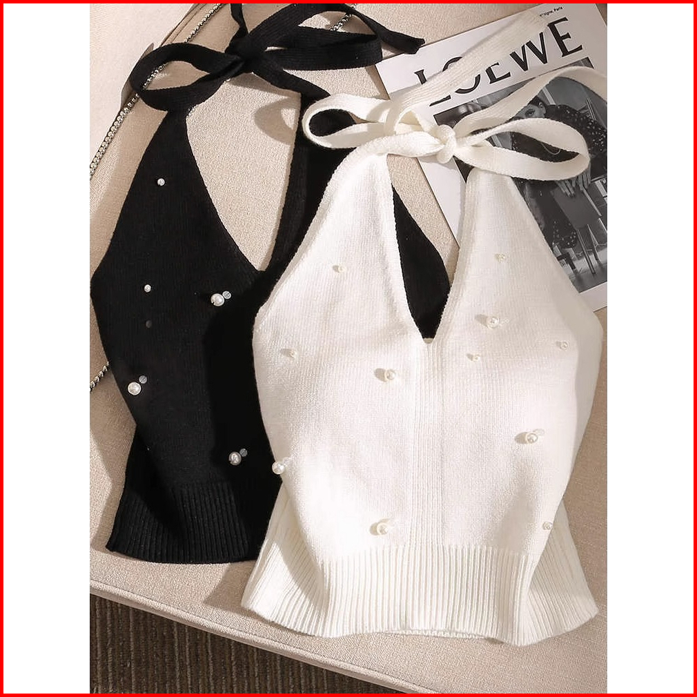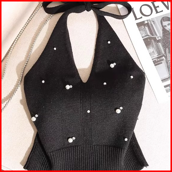 Planet Fantasi Baju Atasan Wanita Terbaru Camisole Top Halter Neck Sleeveless Knitted Pearl 7853
