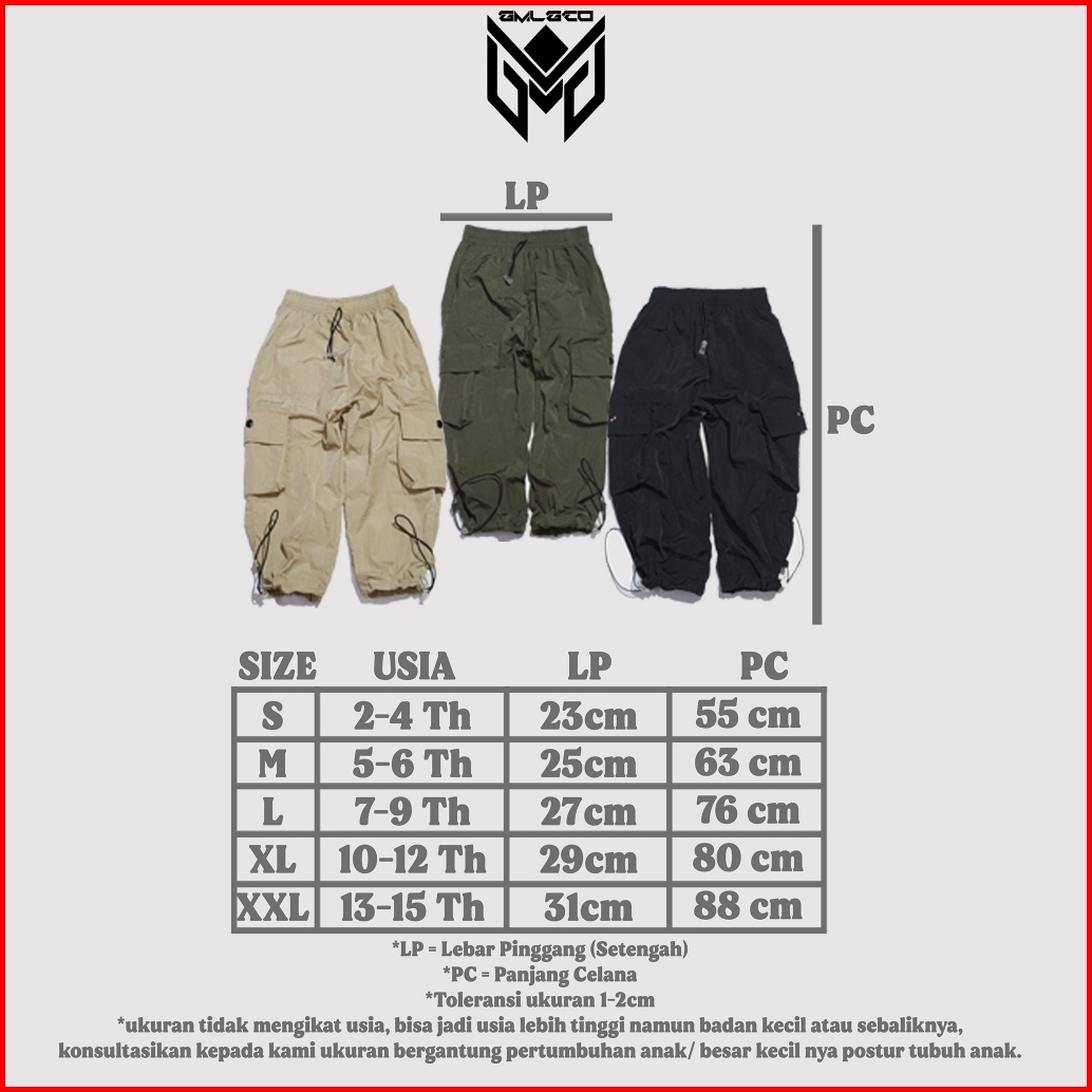 S (2-4tahun), M (5-6tahun), L (7-9tahun), XL (10-12tahun), XXL(13-15tahun)