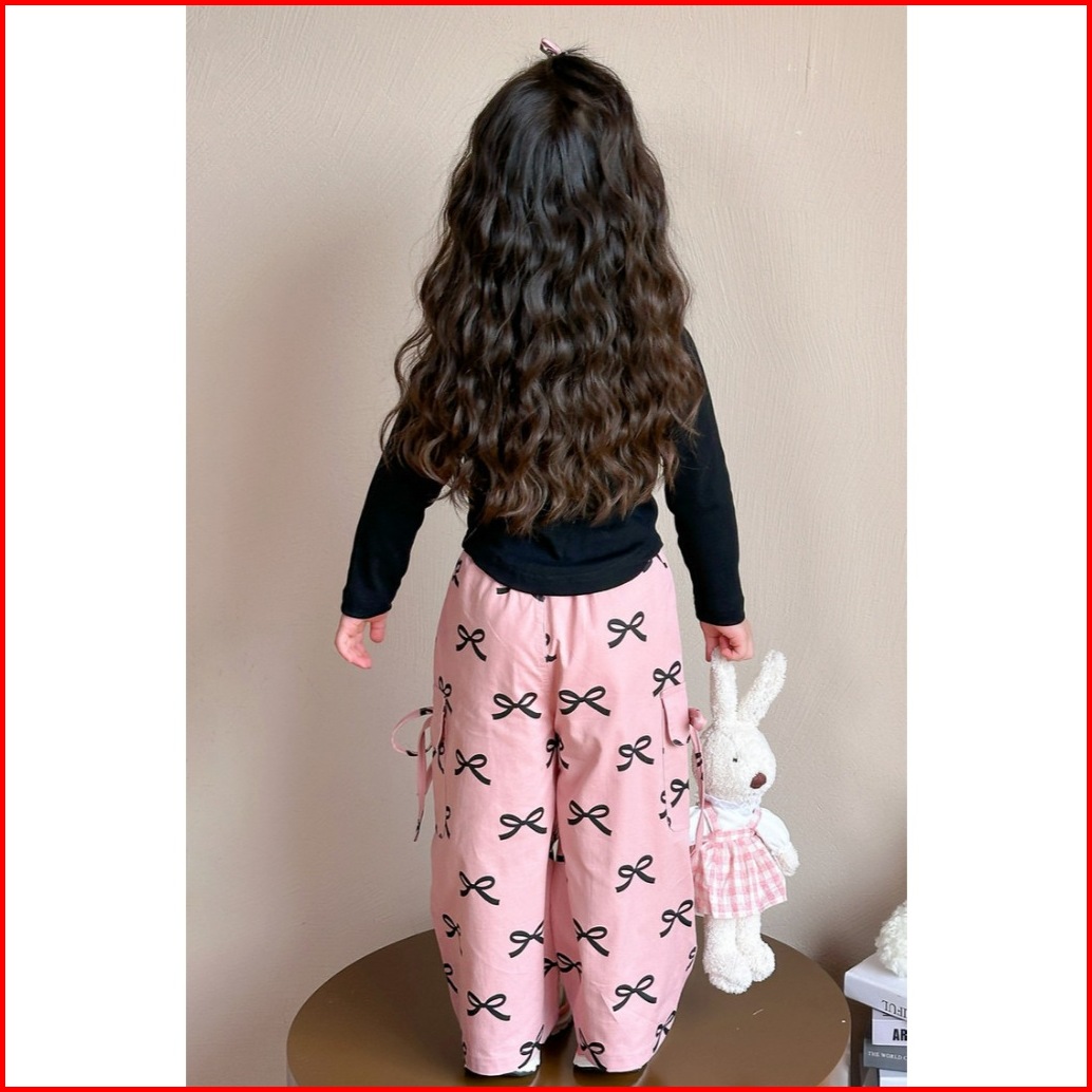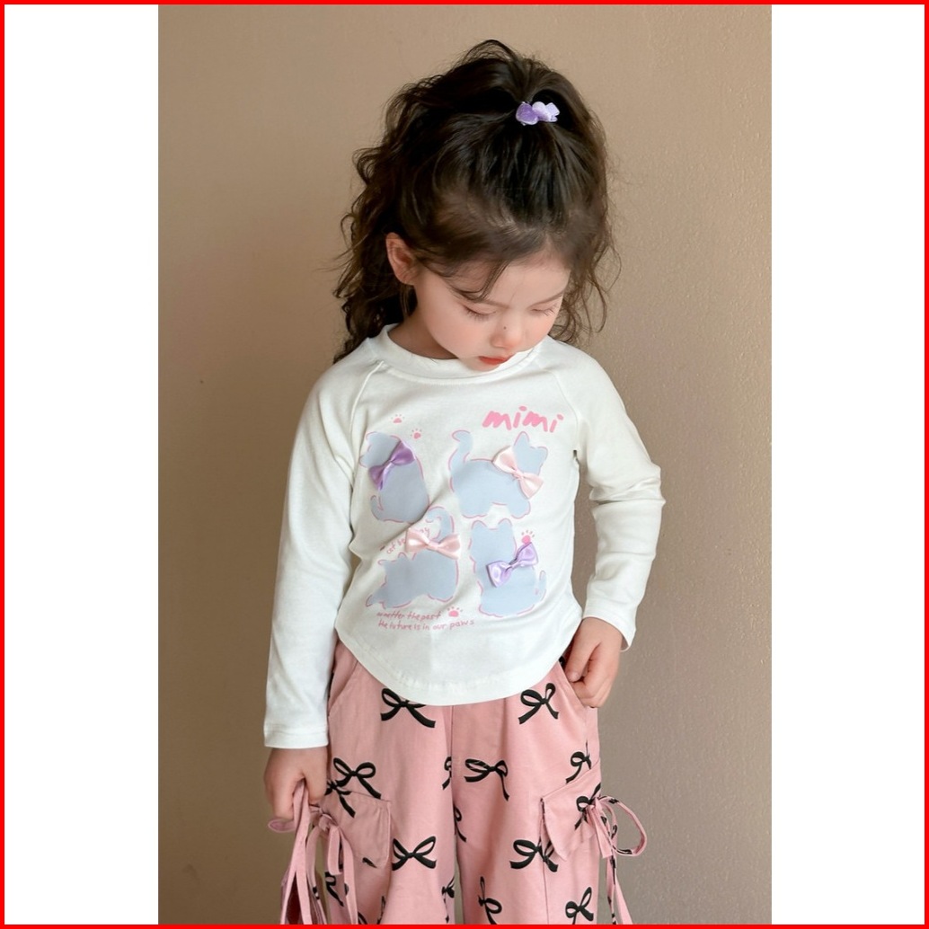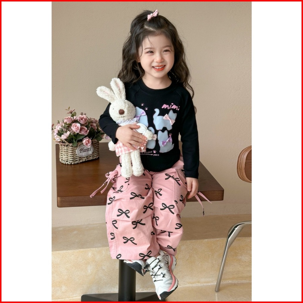 Pandabaju Baju Atasan Lengan Panjang Motif Kucing Lucu Anak Perempuan Stelan Pita Mimi Cargo Celana Anak Perempuan Warna