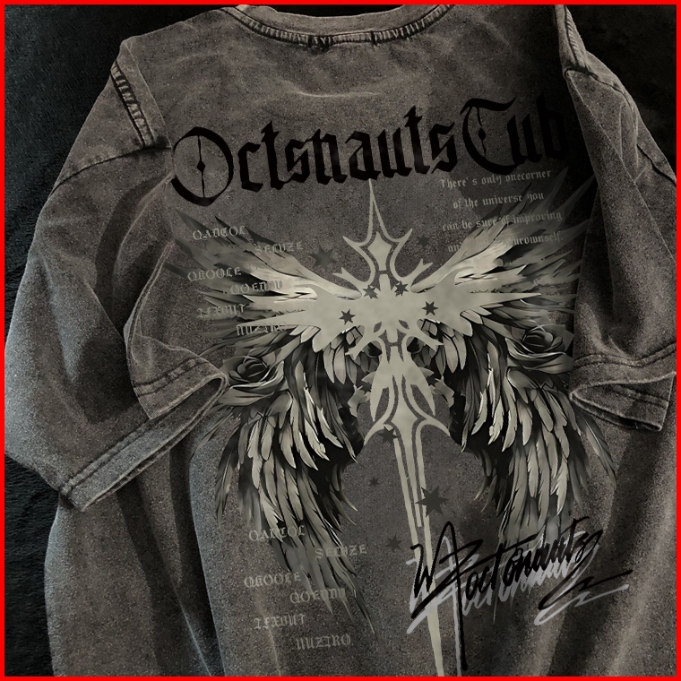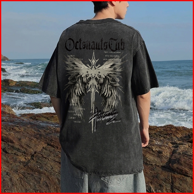 Disneay Kaos Pria T-shirt Baju Kaos Oversize Cetak Sayap Malaikat Antik Amerika Vintage Longgar Kaos Washed Pria Baju Ka