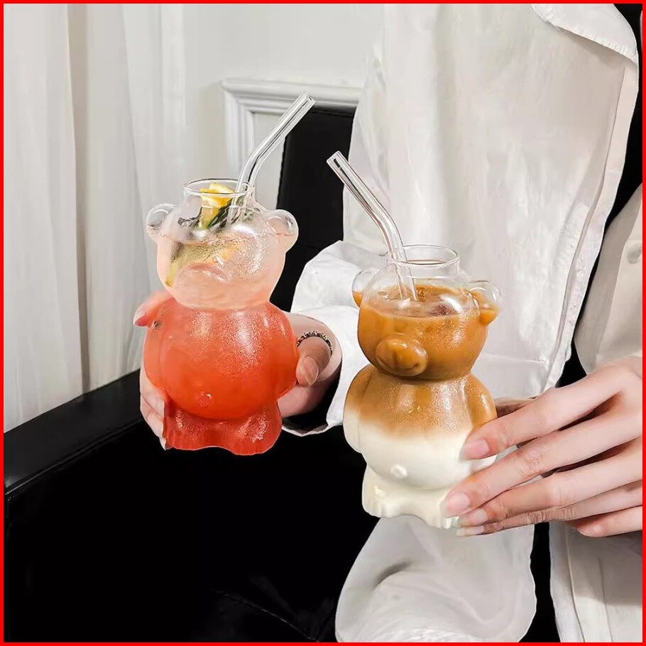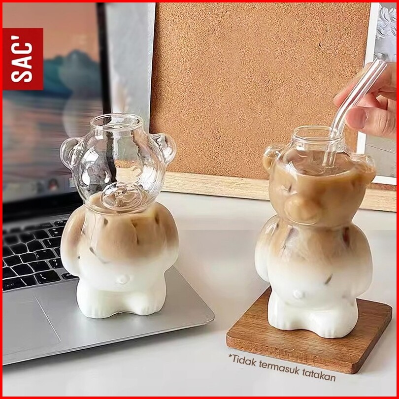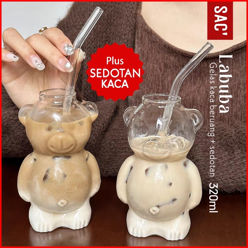 Labuba Gelas Kaca Gelas Matcha Gelas Kopi Gelas Tumbler Lucu Plus Sedotan Estetik Model Beruang Gelas Kopi Susu Aestheti