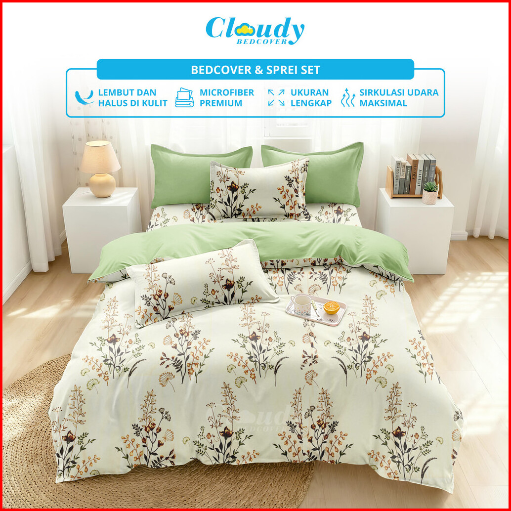 Bedcover Set Sprei Theresia Mix Sage - Ukuran Lengkap 90x200 - 200x200 - Cloudy Bedcover