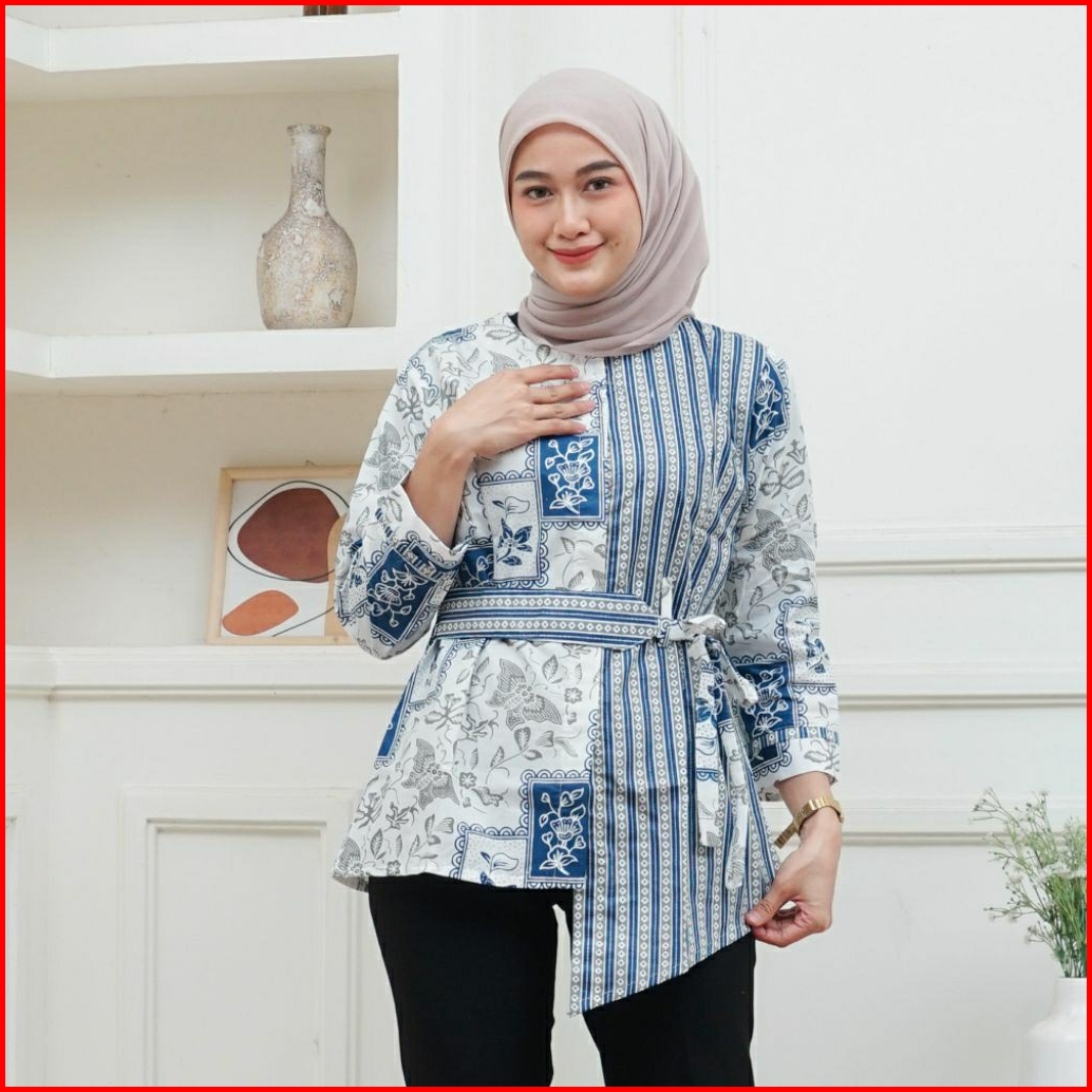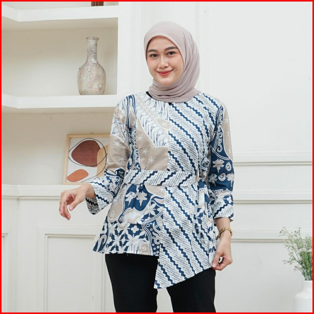 Blouse Batik Wanita Lengan Panjang Atasan Batik Modern Premium Elegan Kekinian Kemeja Kombinasi Motif Waru Coklat