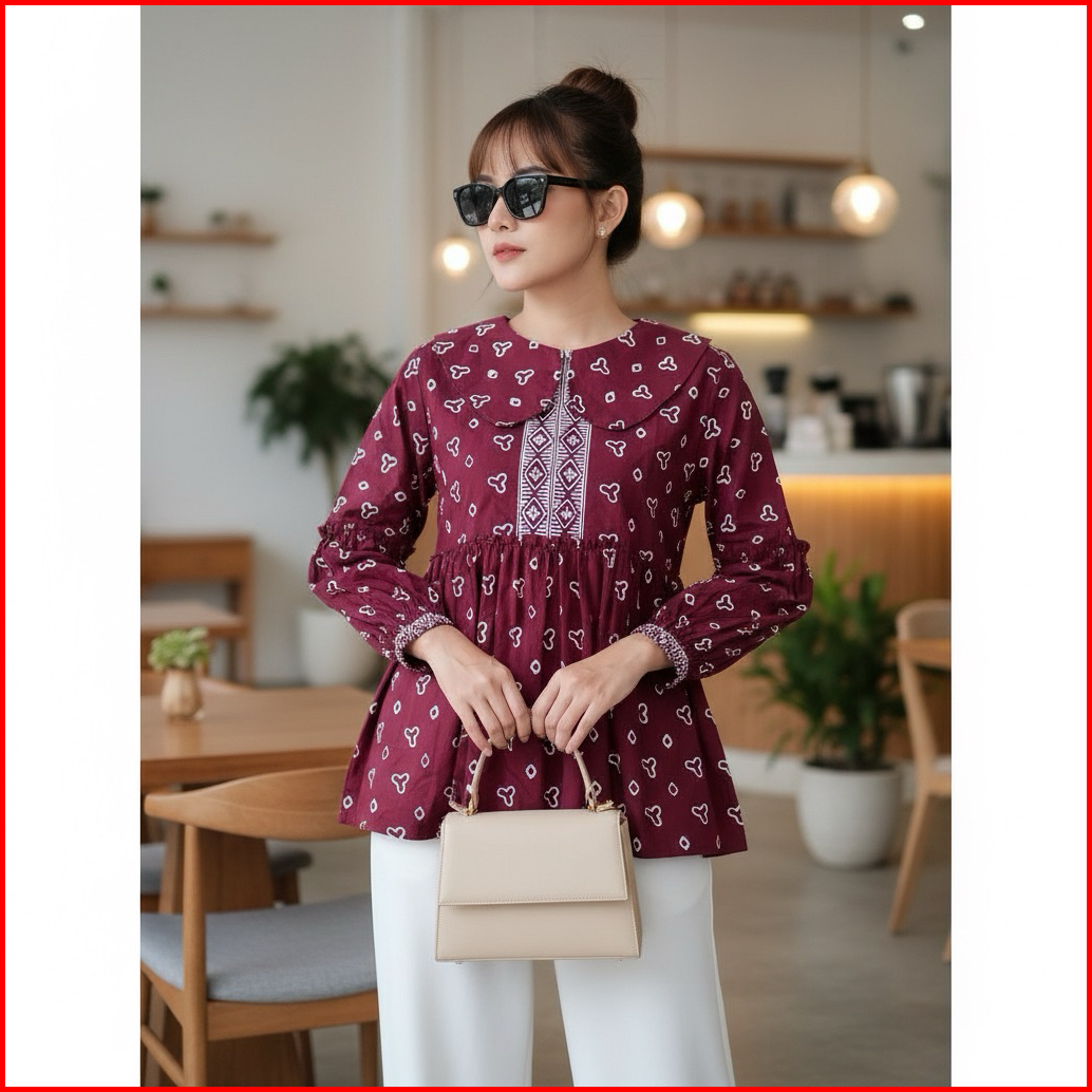 Shanaya Baju Batik Wanita Blus Batik Garutan Batik Sage Green Marun Navy Abu Misty Model Peplum Zipper Depan Lengan Balo