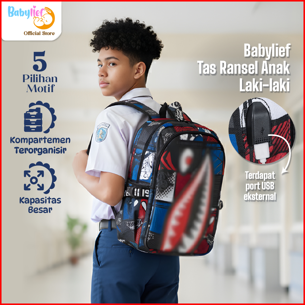 Babylief Tas Sekolah Anak Sd Motif Hiu Bape Graffiti Untuk Anak Sd-smp Anti Air Usb Slot Gadget Praktis Bl062