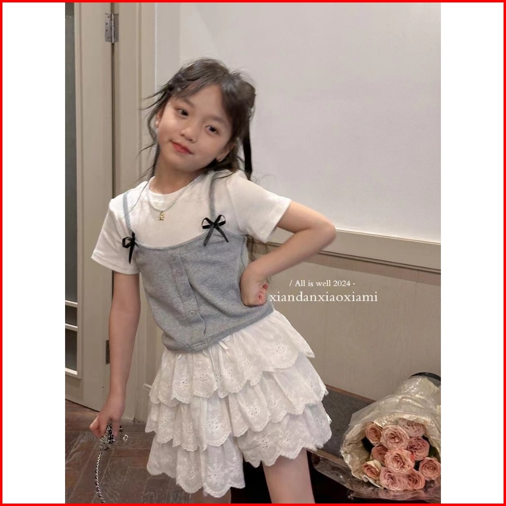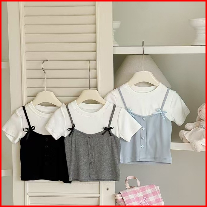 2-10 Tahun Atasan Lengan Pendek Berbahan Katun Pita Versi Korea Untuk Anak Perempuan