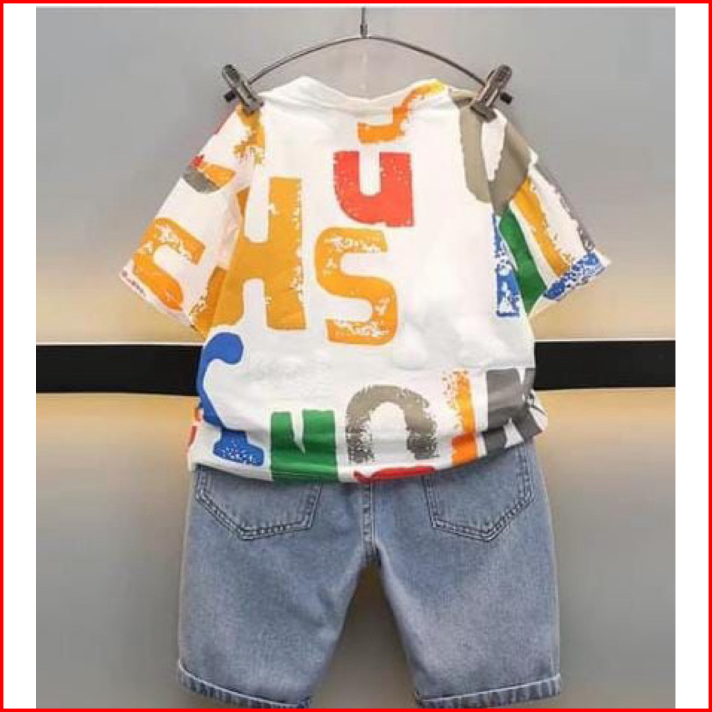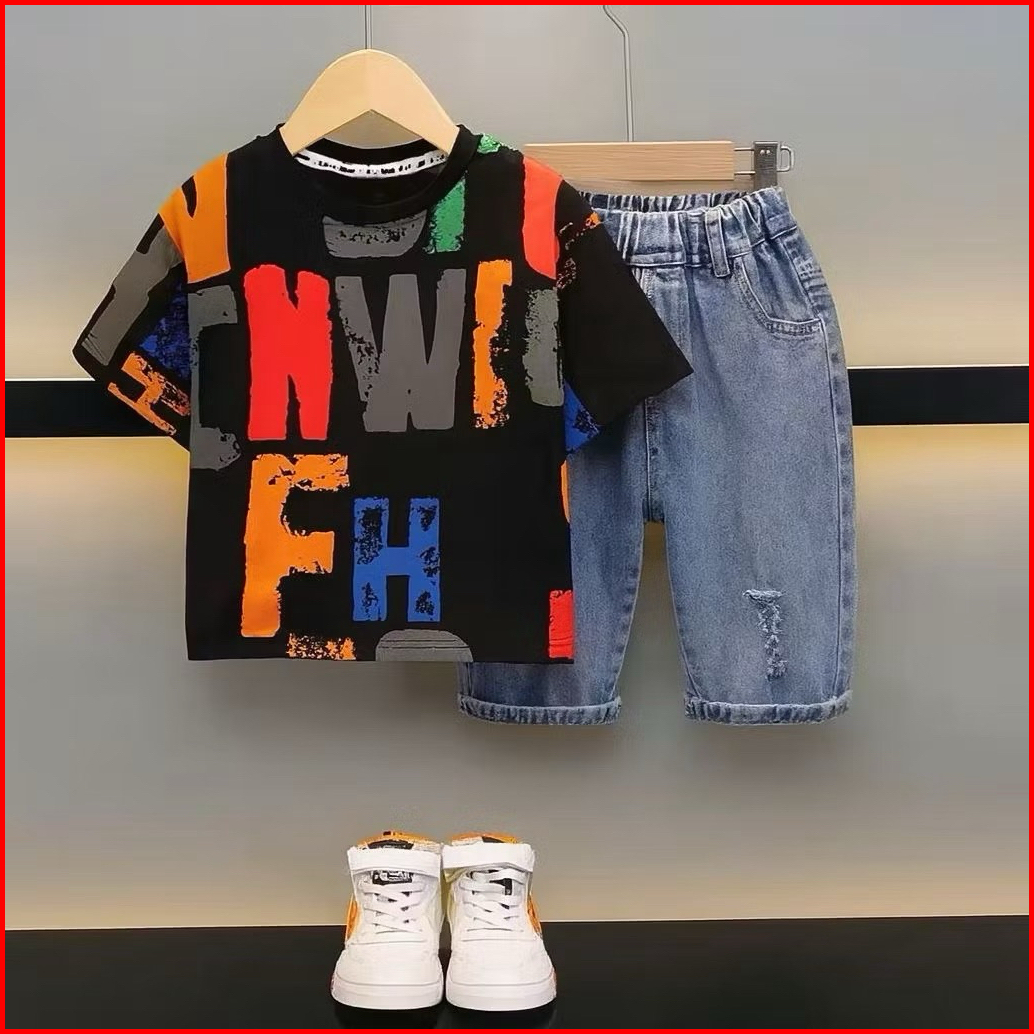 Yuan.kids Setelan Baju Kaos Dan Celana Denim Anak Motif Alphabet Usia 1-5 Tahun Top Fashion