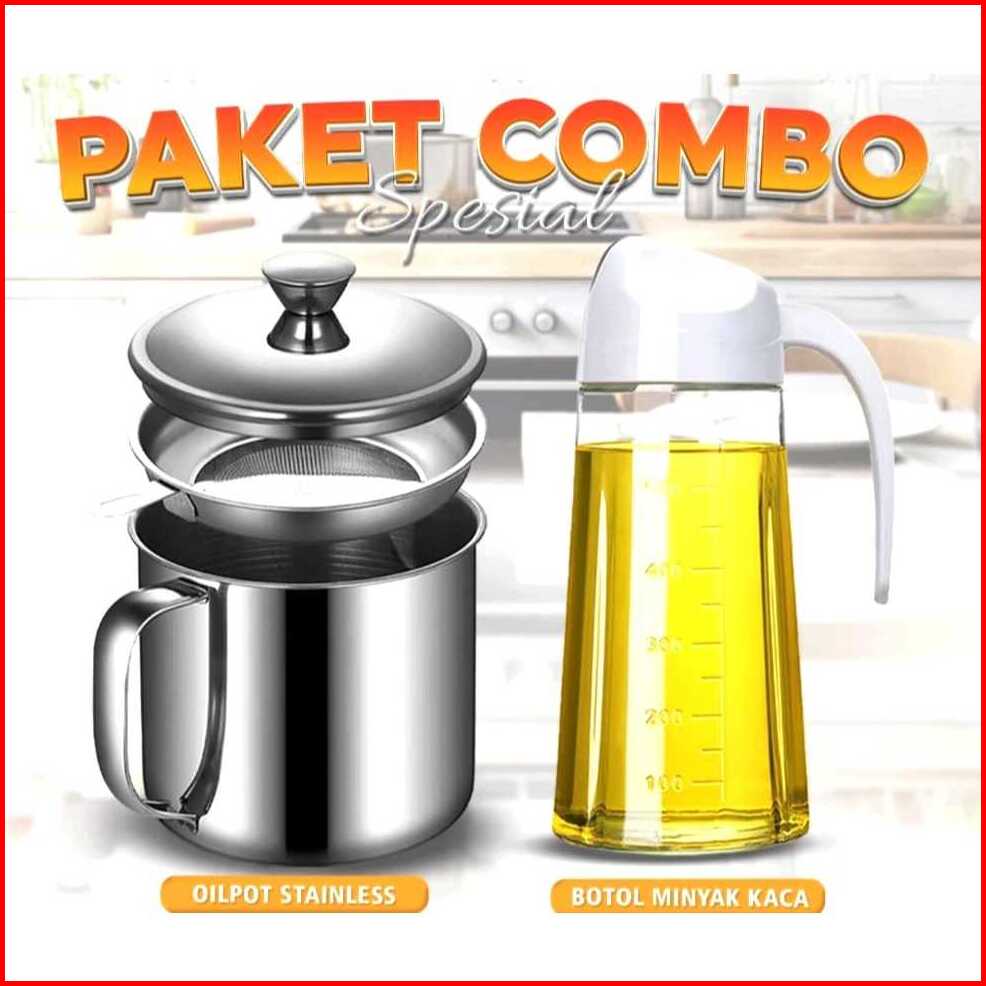 Rdm Paket Combo - Botol Minyak Kaca 630ml Oil Pot Wadah Minyak Stainless Steel 1 Liter