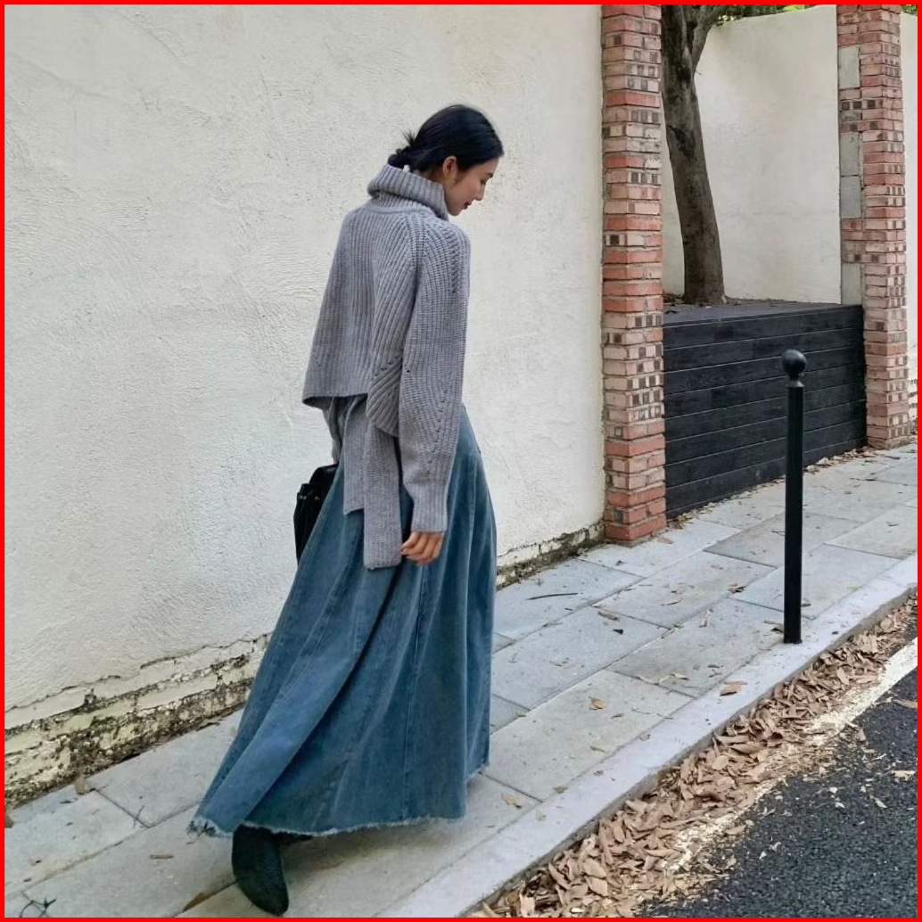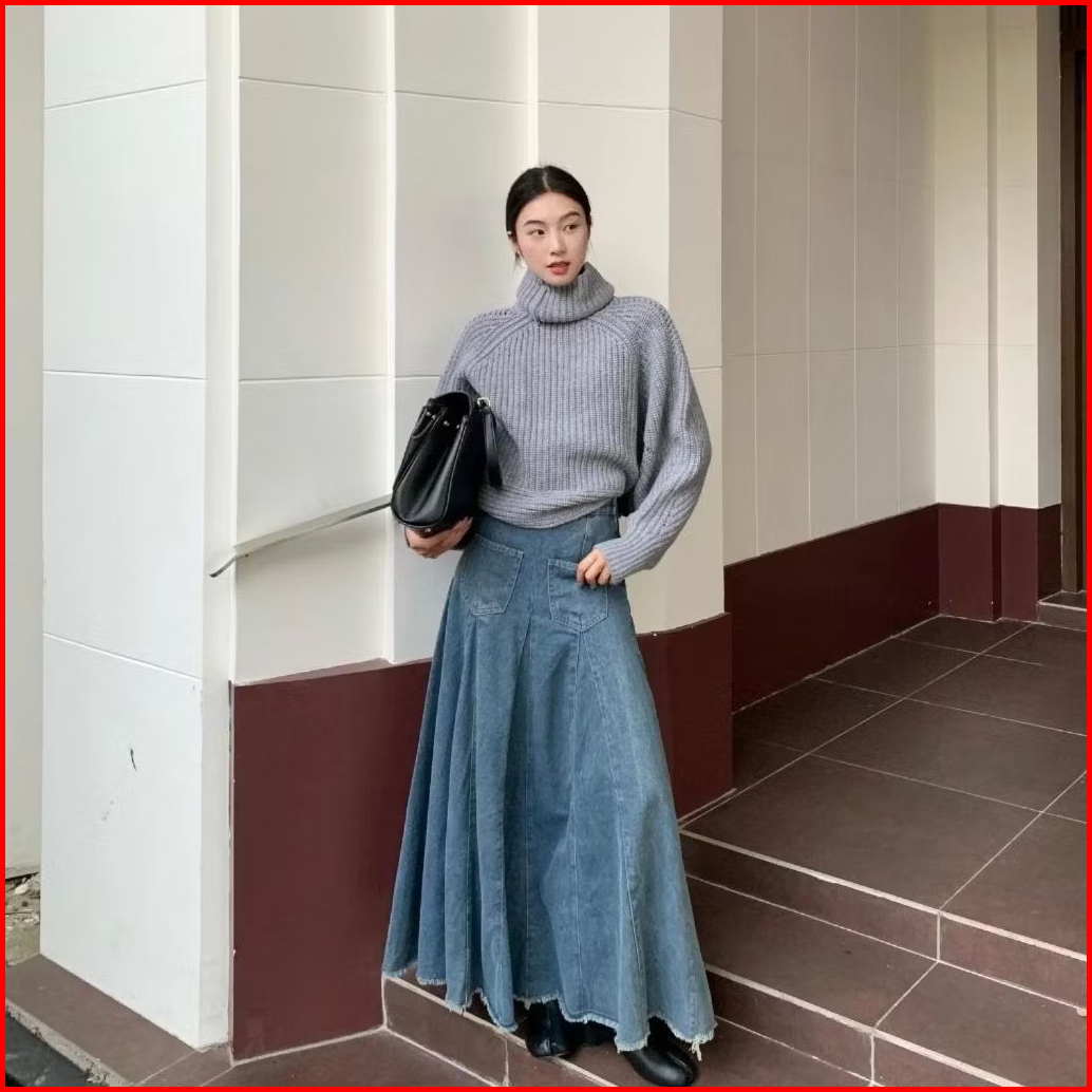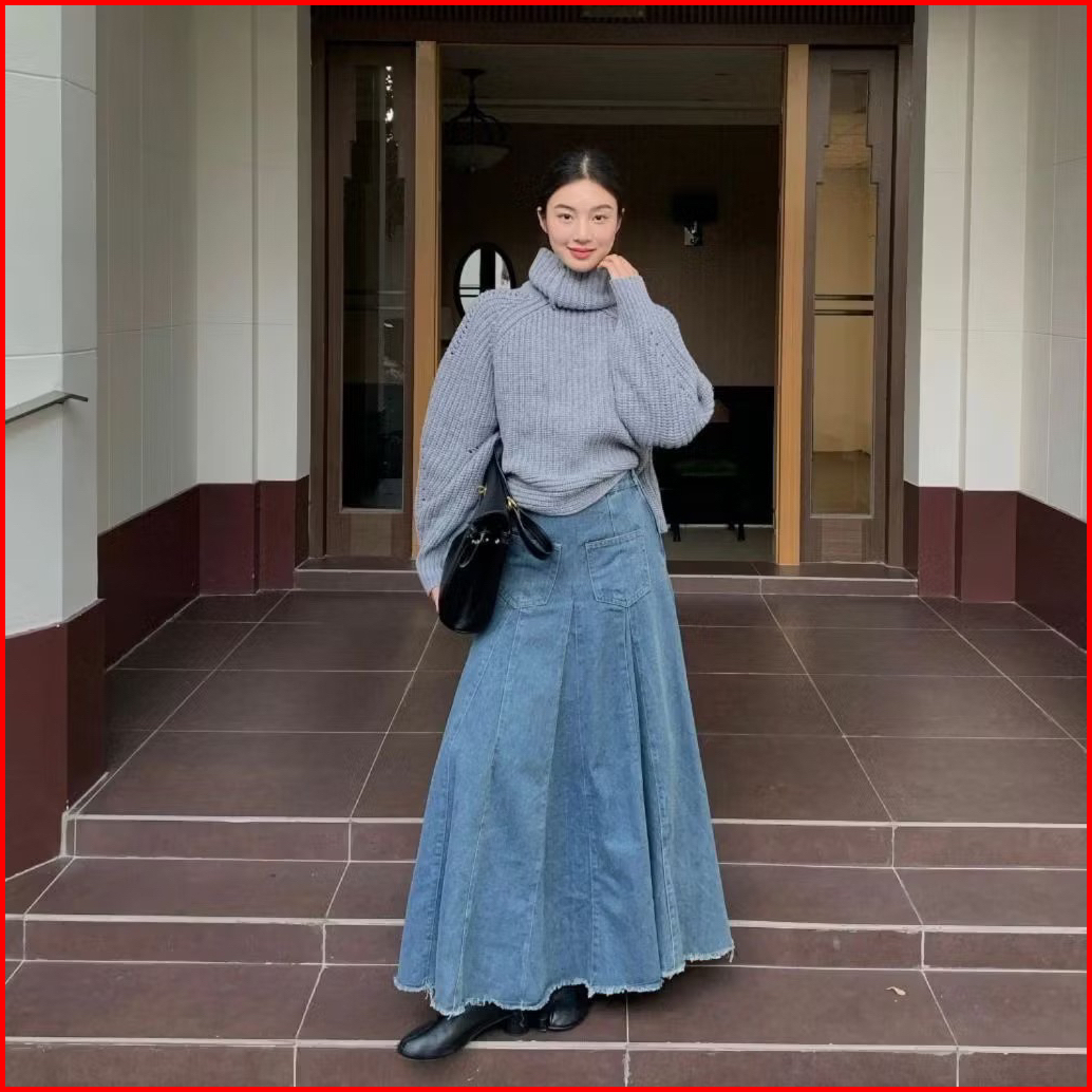 Rok Jeans Wanita Unfinish Cutting Model 2 Kantong Depan Hight Waist Bahan Soft Jeans Color Medium Blue Flared Rok Models