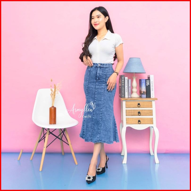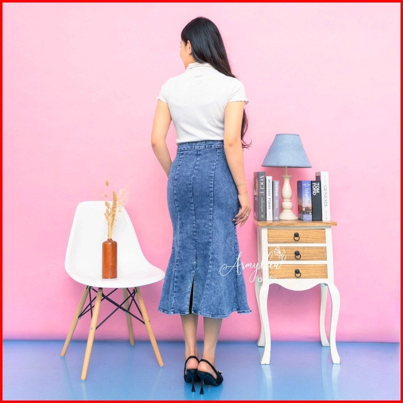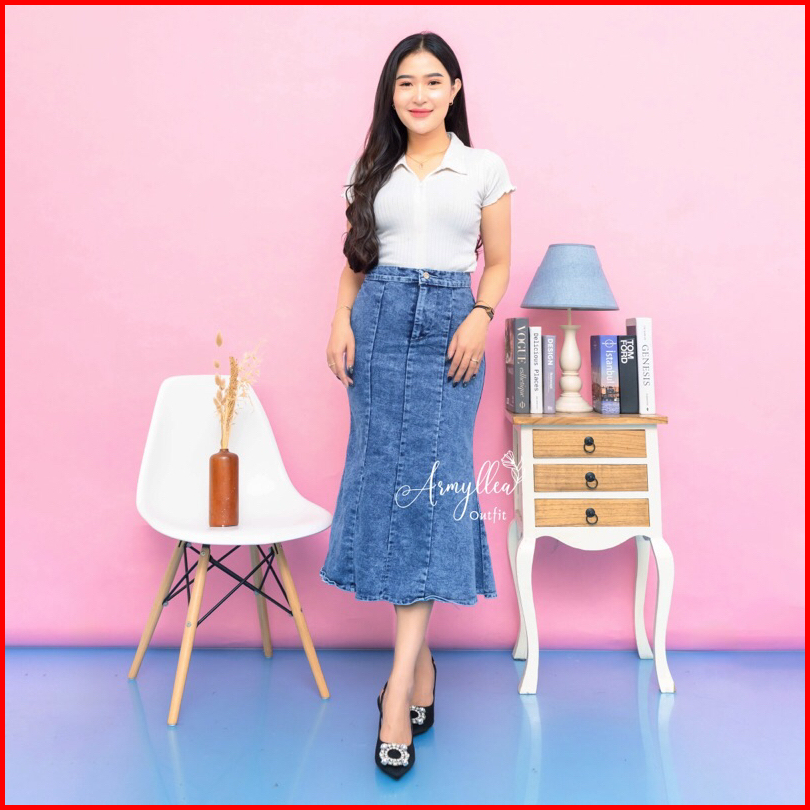 Rok Jeans Mermaid Midi Skirt Duyung Highwaist Wanita Casual Jeans Stretch Mulur Muat Bb Jumbo