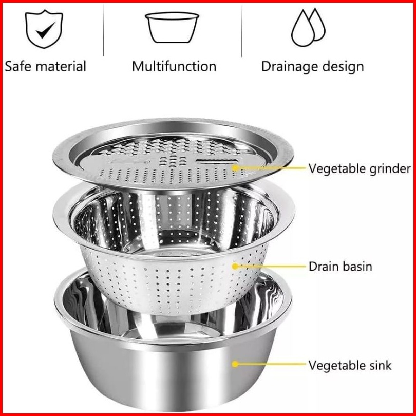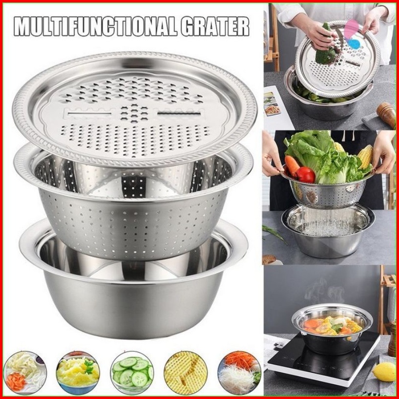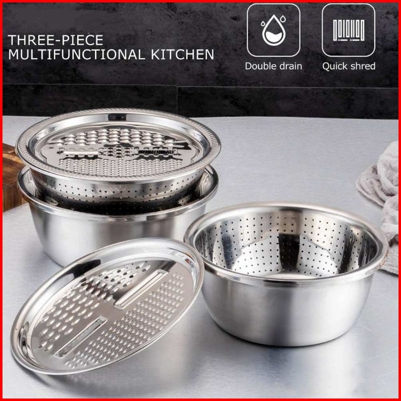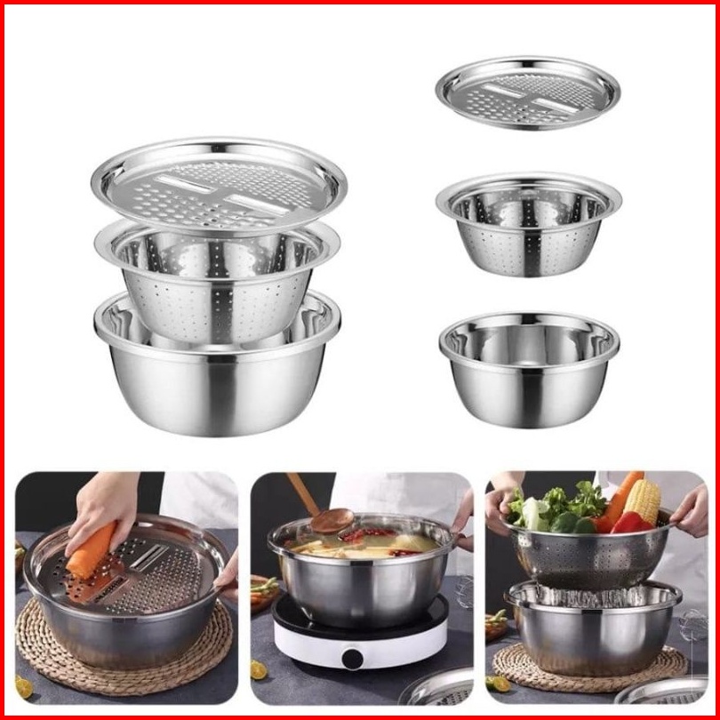 Baskom Parutan Serbaguna Set 3 In1 Stainless Drain Basin Rice Washing Strainer Set Kitchen Grater Set Bowl Parut Iris Po