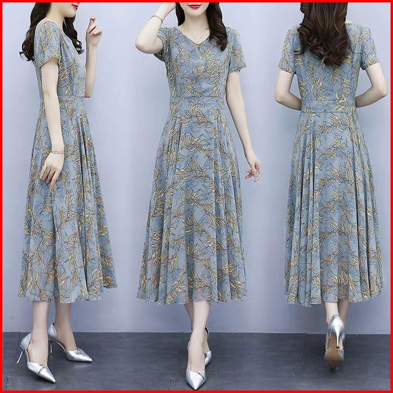 Dress Korea Wanita Lengan Pendek Gaun Biru Motif Bunga Dress Pesta V Neck Elegan
