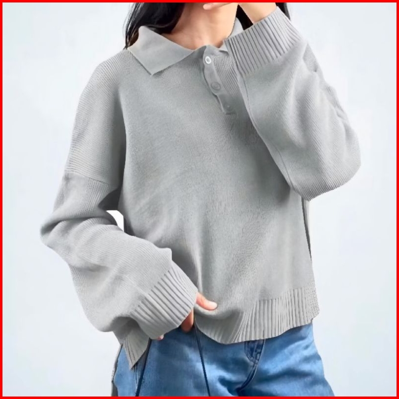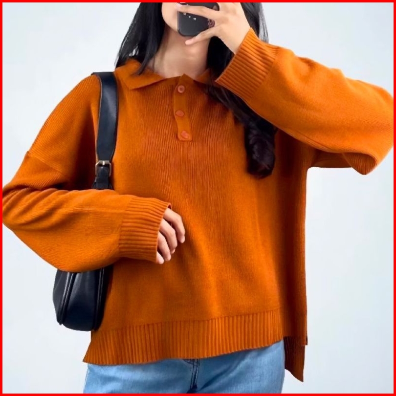 Enzy Sweater Knit Rajut Kerah Polo Kancing Depan Seweater Rajut Wanita Style Korean