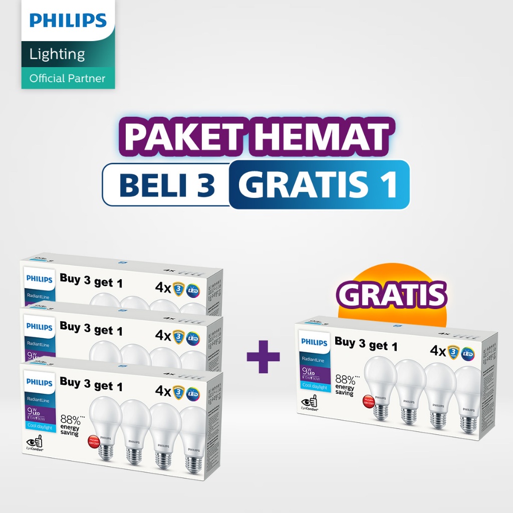 Beli 3 Gratis 1 Philips Lampu Multipack RadiantLine LEDBulb 9W 6500K Putih