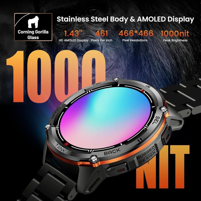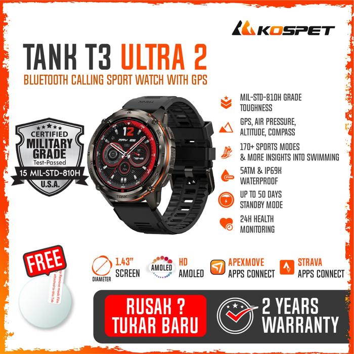 Kospet Tank T3 Ultra 2 Us 15 Military Grade Rugged Smartwatch Gps 1.43” Amoled 170+ Sports Modes Strava Support - Black