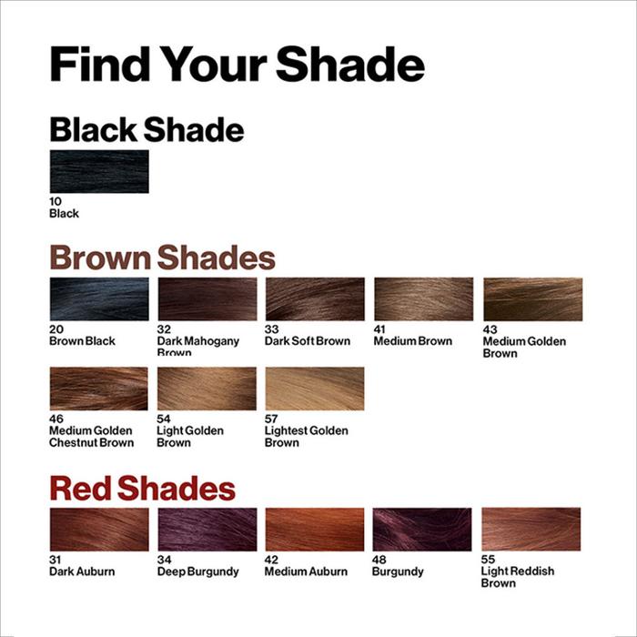 Black 10, Brown Black 20, BrownBlack 20, Burgundy 48, Cherry Red 66, Dark Ash Blonde 60, Dark Auburn 31, Dark Brown 30, Dark Mahogany Brw 32, Dark Soft Brown 33, Deep Burgundy 34, DeepBurgundy34, Light Ash Brown 50, Light Gld Brown 54, Light Reddish Brw 55, Lightest Gld Brw 57, Med Gld Chest Brw 46, Med Golden Brown 43, Medium Auburn 42, Medium Brown 41, Medium Brown41