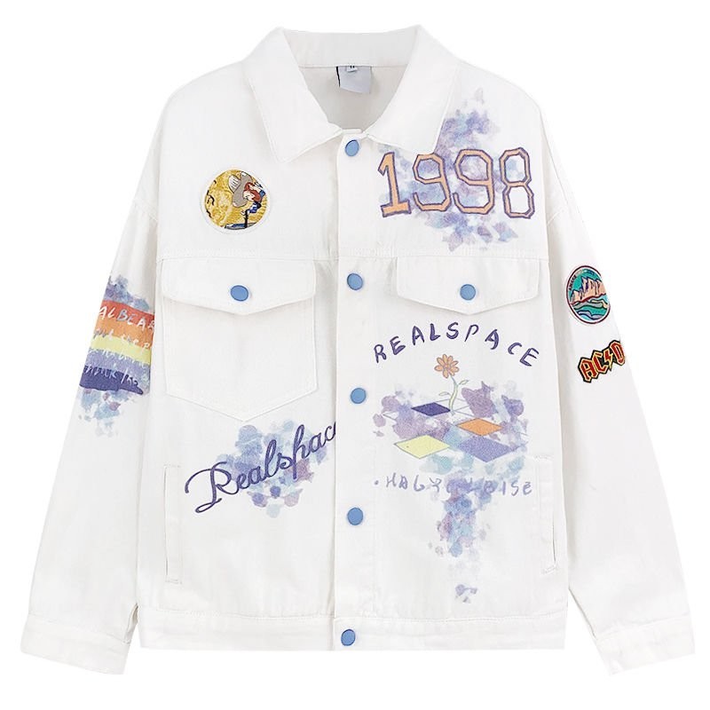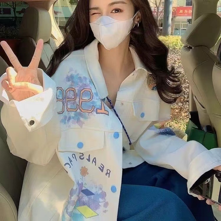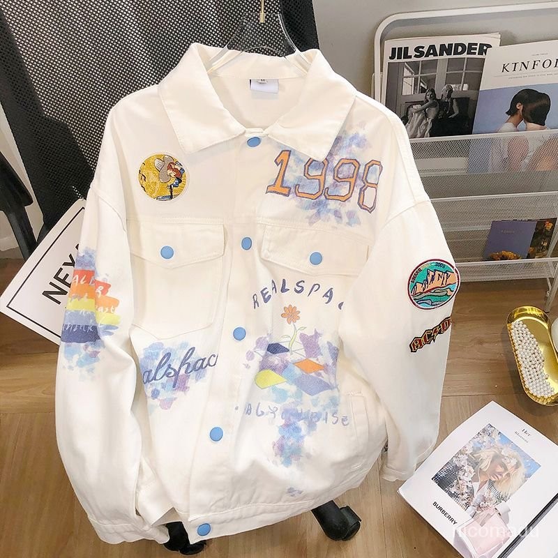 Jaket Jeans Oversize Putih Wanita /Jaket denim motif grafiti vintage wanita korean style