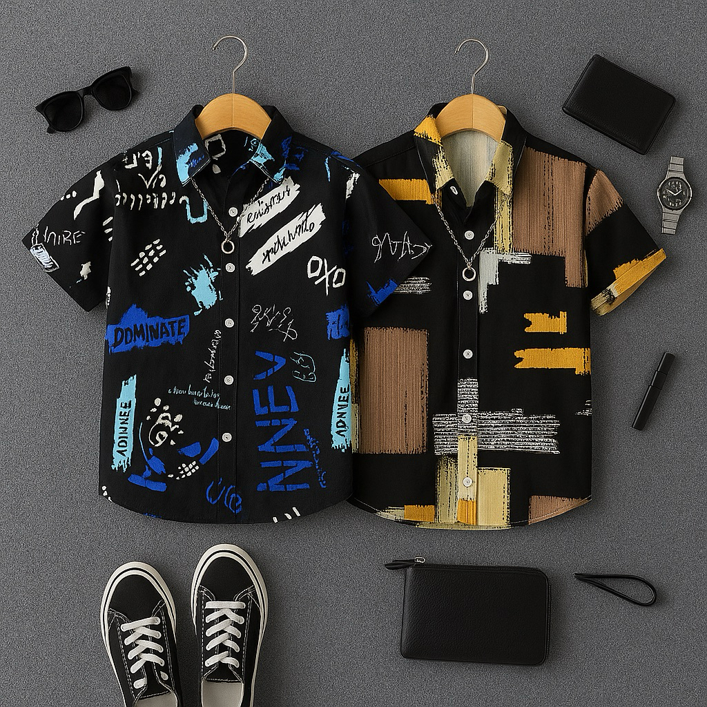 Paket 2 Kemeja Motif Surfing Pria Wanita Lengan Pendek Distro Katun Nyaman Slimfit