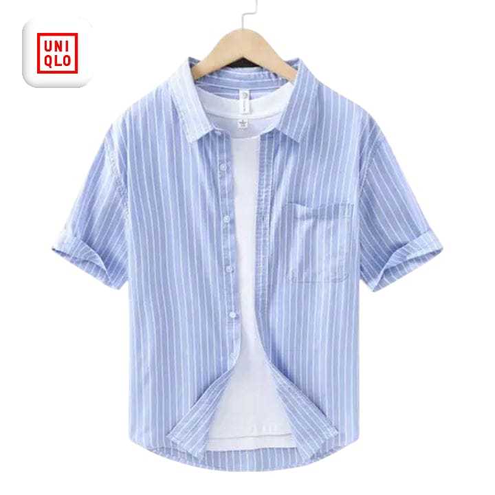 Kemeja Pria Lengan Pendek Motif Garis Stripe Slim Fit Kemeja Casual Cowok Model Kekinian