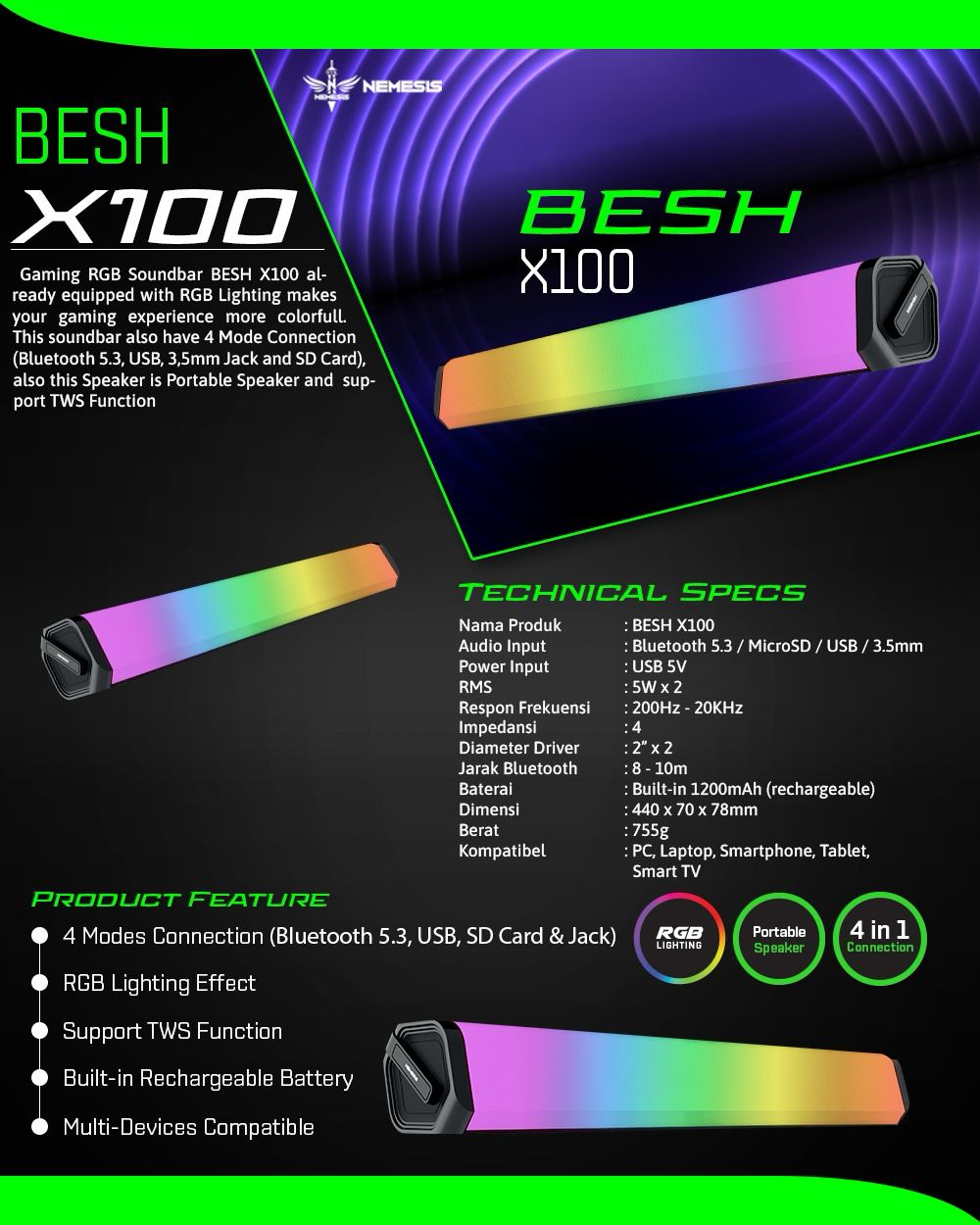 Speaker Bluetooth Portable Nemesis BESH X100 Soundbar RGB TWS Stereo Untuk PC Laptop HP