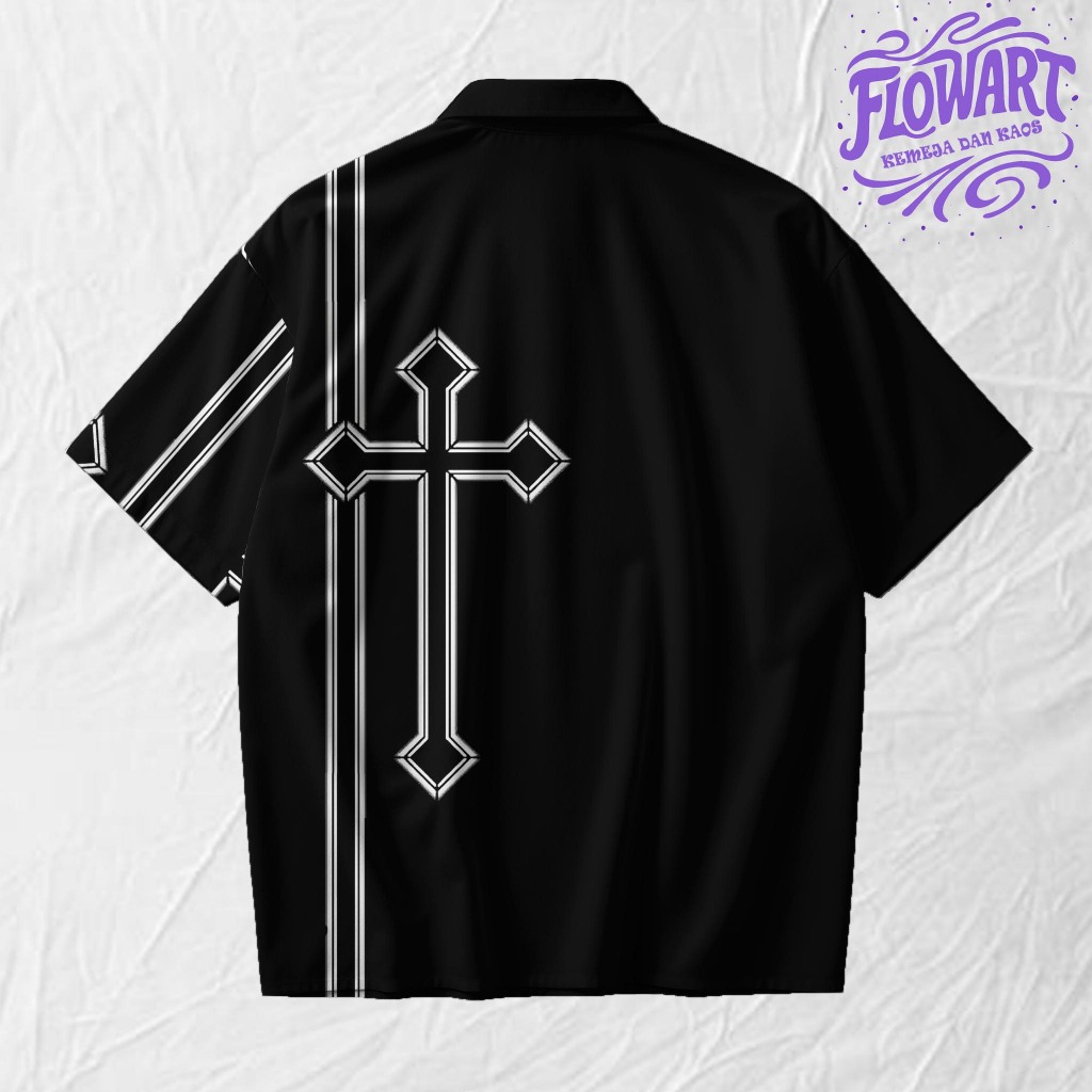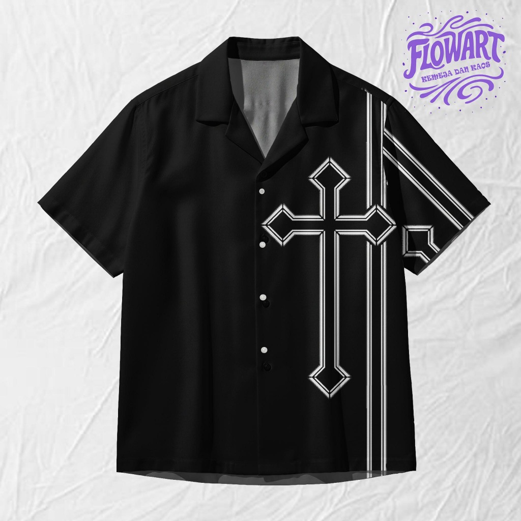 FLOWART Kemeja Rohani Redemption – Kemeja Pria Salib Kristen, Desain Minimalis Grafis Modern Bahan Adem Premium | LOW39