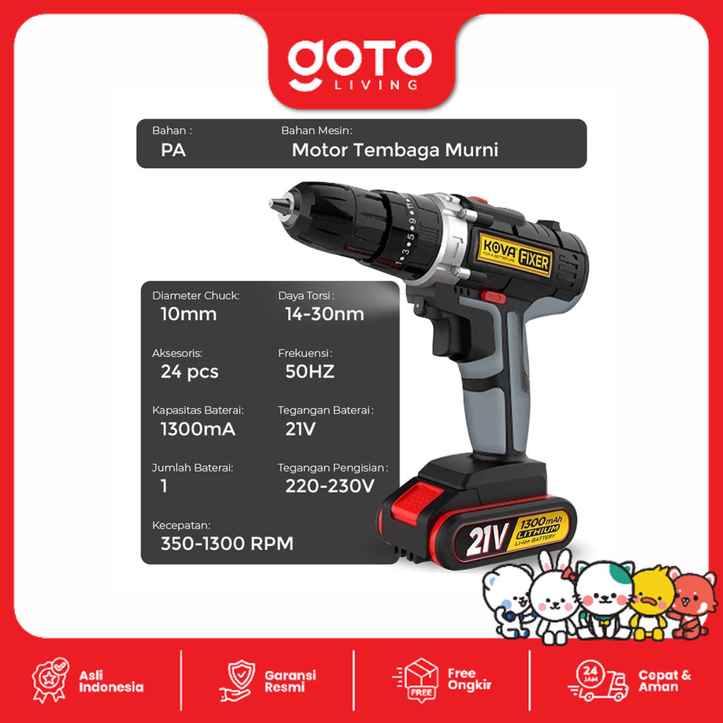 Kova Fixer Cordless Drill 10mm Set Mesin Bor Tangan Baterai Tembok 21V