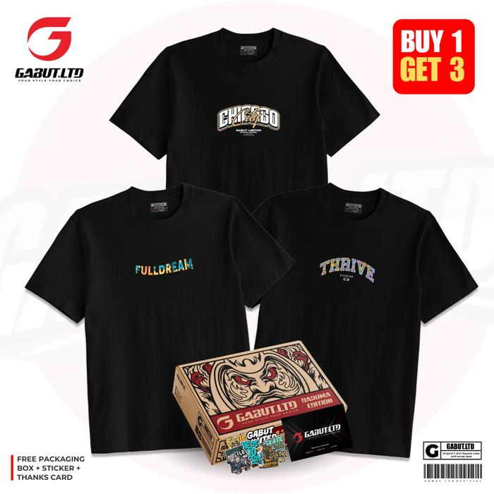 Gabut - Paket Bundling 3Pcs Baju Kaos Distro Unisex Motif Thrive, Fulldream, Chicagocity, Bahan Cotton Combed 24S Kaos