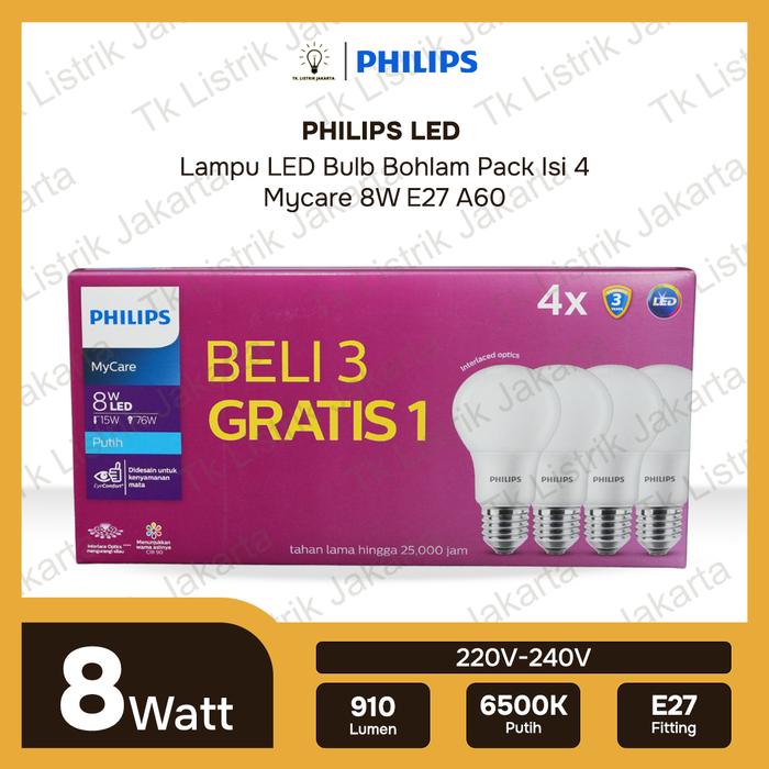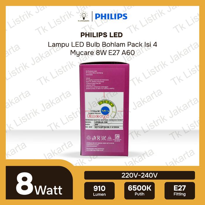 Lampu LED Bulb Bohlam Pack Isi 4 Philips Mycare 8W E27 A60 6500K Putih