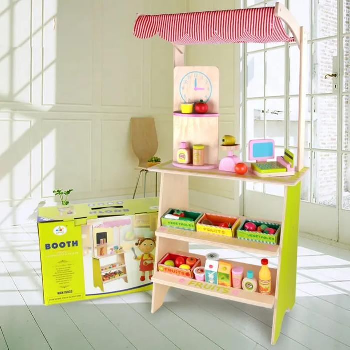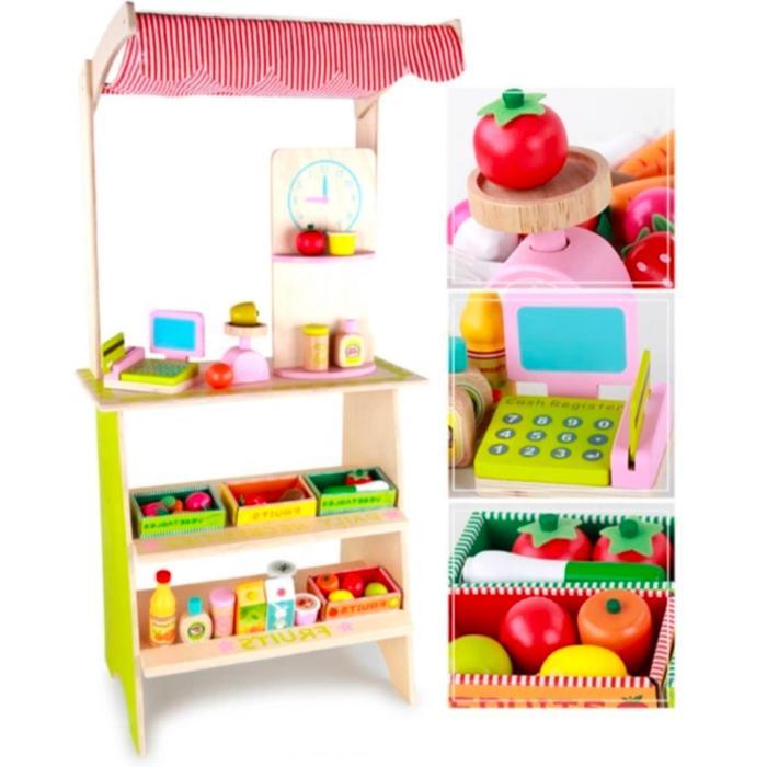 MAINAN ANAK PRETEND PLAY GEROBAK KASIR PASAR JUALAN BUAH & SAYUR COCOK UNTUK HADIAH - BOOTH MARKET WOODEN TOYS