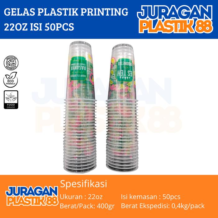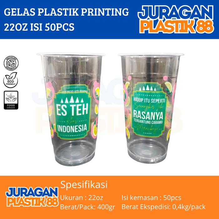 Gelas Plastik Printing Datar 22oz Tip Top Isi 50pcs Gelas Juice Es Teh Buah Gelas Datar Printing