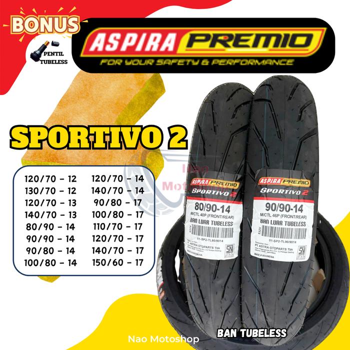 Ban Tubeless Aspira Premio Sportivo 2 Ring 12 13 14 17 Vario Beat Mio Scoopy Supra Jupiter Nmax Cb150 - 120/70 - 12