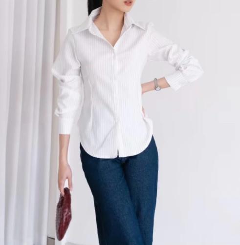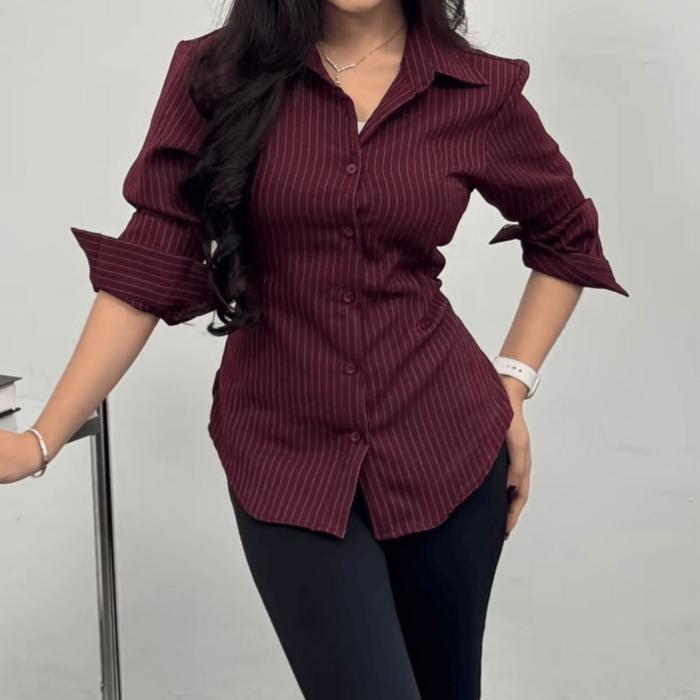 Nara - Stripe Kemeja Fitted - Kemeja Wanita Fitted Stripe Salur Basic Casual - Nara - Black Stripes, S - M