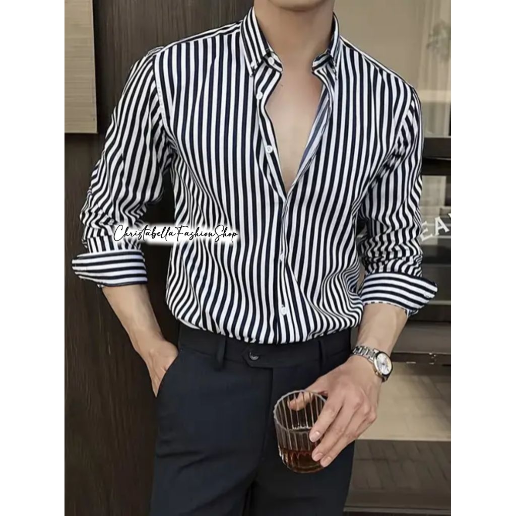 Kemeja Cowok Stripe Lengan Panjang / Kemeja Salur Black Pria Motif Garis Premium Atasan KemejaTrendy