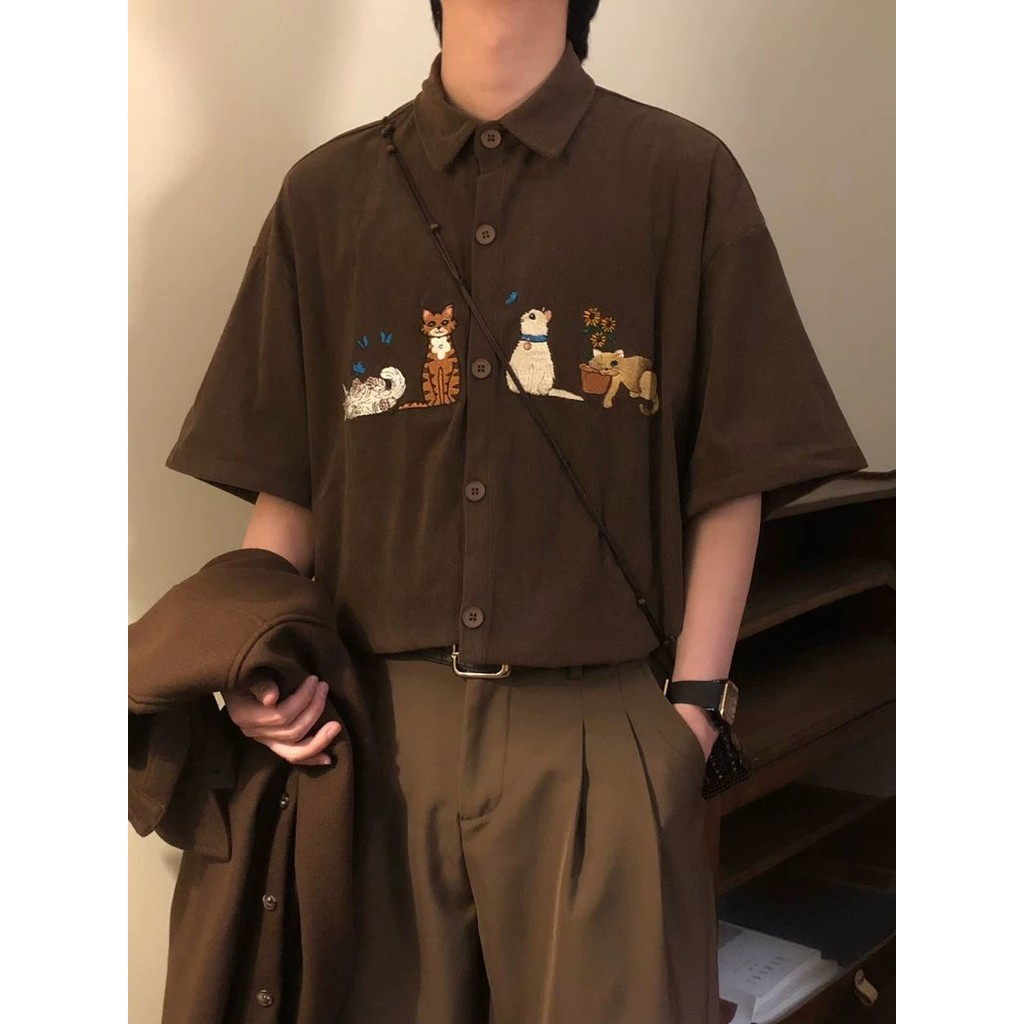 Roar Wild.YY-Merek Tren Retro Amerika Gaya Kuliah Bordir Kucing Serbaguna Kasual Lengan Pendek Atasan Kemeja Untuk Pria Dan Wanita