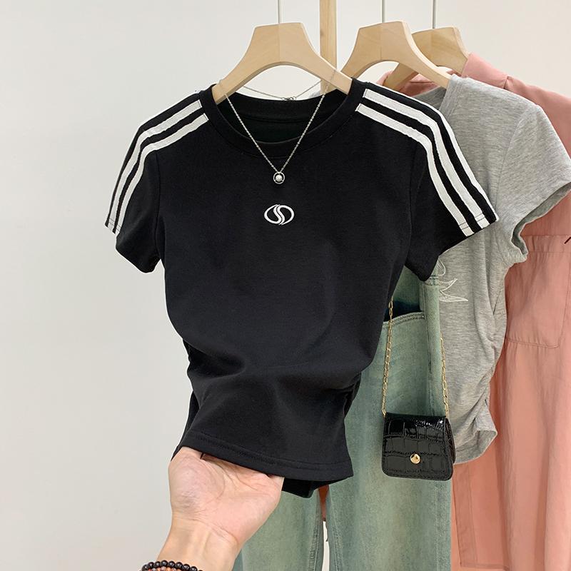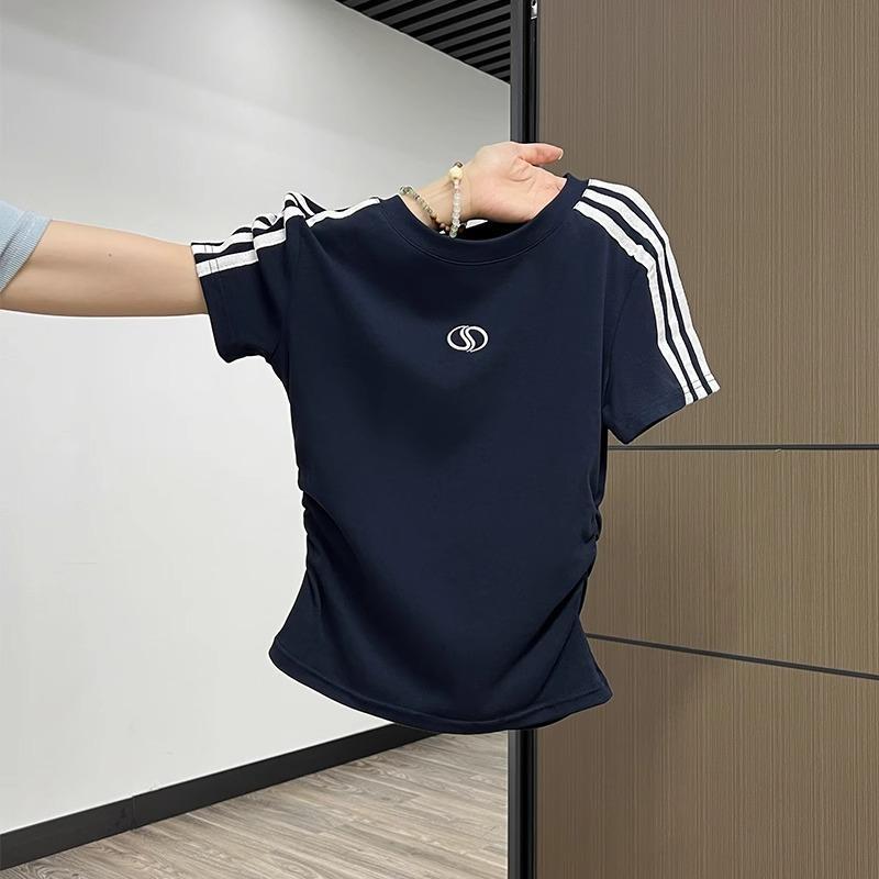 T-Shirt Lengan Pendek Bordir Bergaris Wanita Crop Top Ramping Lipit Biru Laut