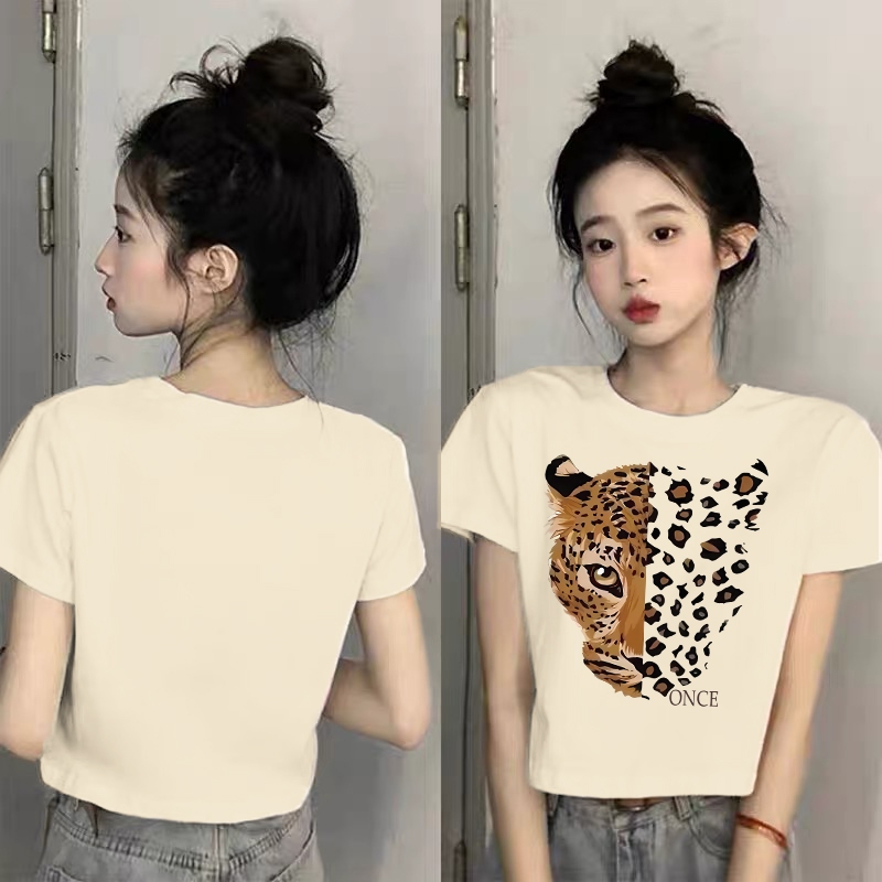 The Monseur Gallery T-Shirt Crop Top Kaos Wanita Crop Top Korea Cartoon Leopard | Baju Croptee Cream Korea