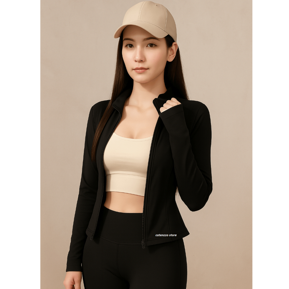 Jaket fitnes wanita Olahraga gym Slimfit Polos Lengan Panjang cepat kering dengan resleting yoga / lari anti uv