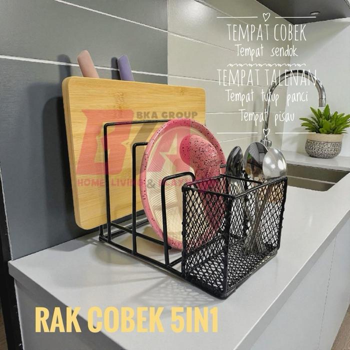 Rak Cobek 5in1 Anti Karat Multifungsi untuk Sendok Talenan Tutup Panci & Pisau Bahan Besi Mewah