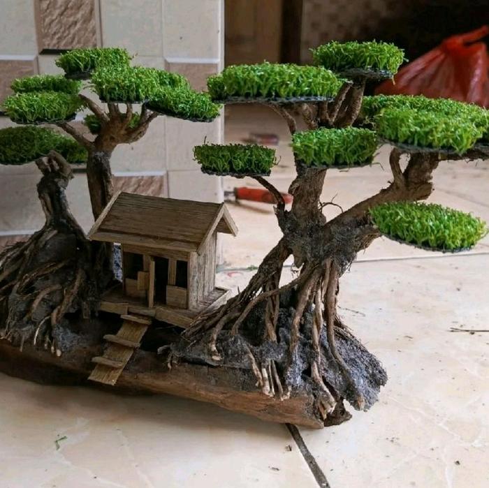 bonsai sintetis rumah miniatur 2 tiang dekorasi aquarium aquascape