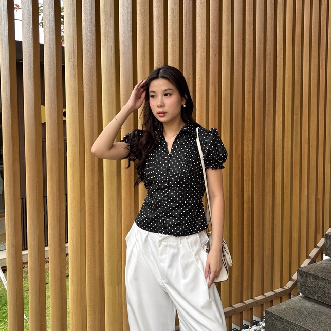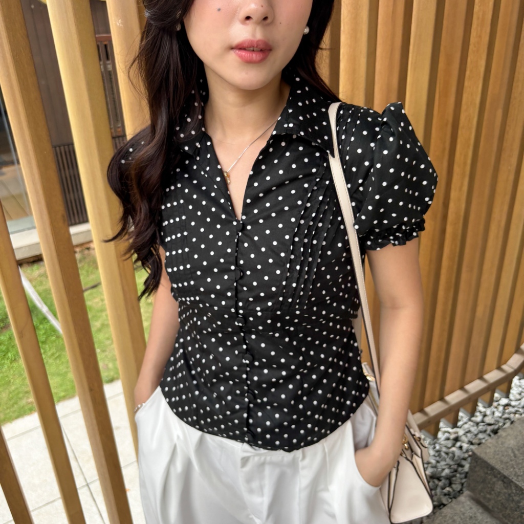 Isa Top Polkado Shirt Shortsleeve Woman Puff Fitted Shirt / Atasan Polkadot Lengan Pendek Wanita Eleonor