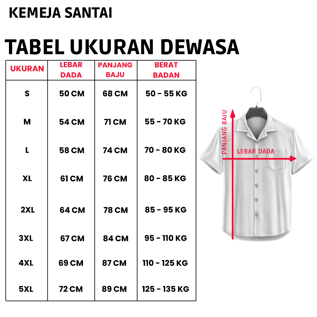 Dewasa S, Dewasa M, Dewasa L, Dewasa XL, Dewasa 2XL, Dewasa 3XL, Dewasa 4XL, Dewasa 5XL, Anak 1-2 TH, Anak 2-4 TH