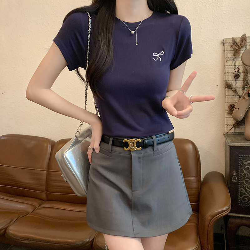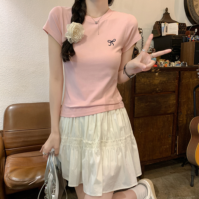 Kaus Leher Bulat Bordir Katun Murni Merah Muda Terbaru Atasan Seksi Fashion Wanita Gaya Korea