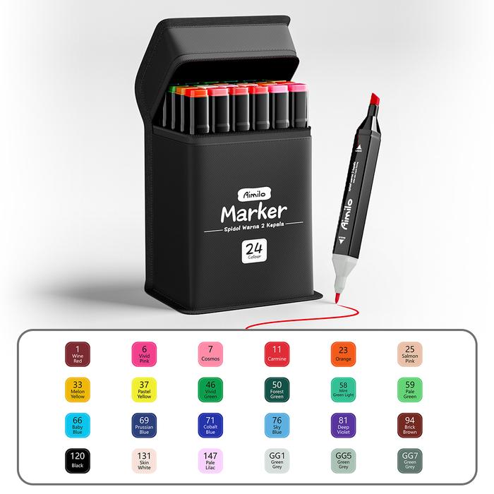 [READY] Aimilo Spidol Warna Warni 1 Set Sketch Marker 2 Tip kartun Touch Marker 24/36/48/60/80 Warna - Isi 24