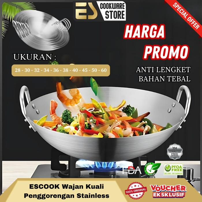 ESCOOK Wajan Kuali Penggorengan Stainless Steel Anti Lengket Cepat Panas Wajan Ukuran Lengkap Mudah