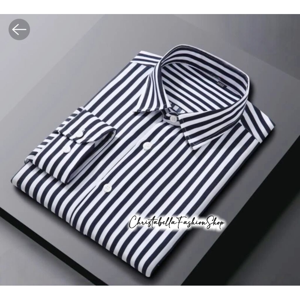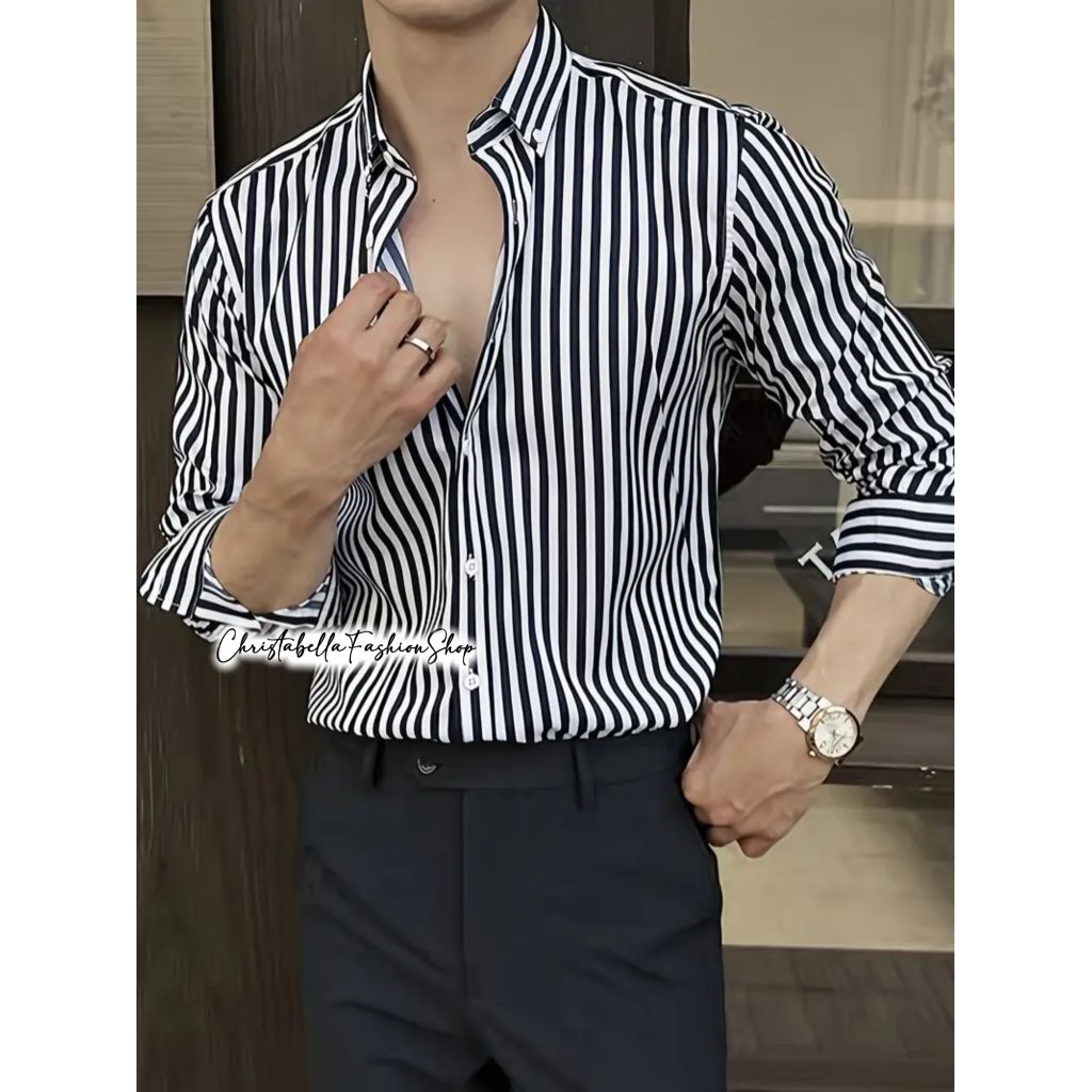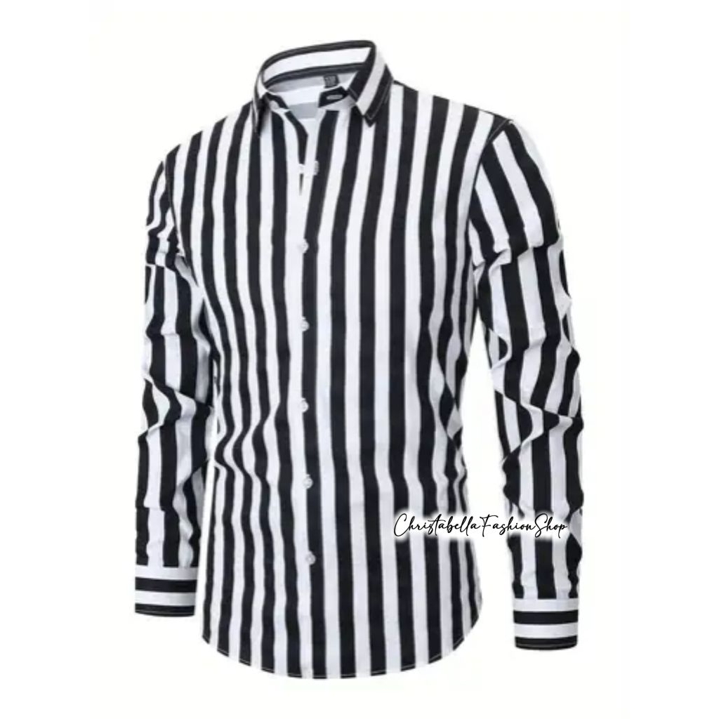 Kemeja Cowok Stripe Lengan Panjang / Kemeja Salur Black Pria Motif Garis Premium Atasan KemejaTrendy