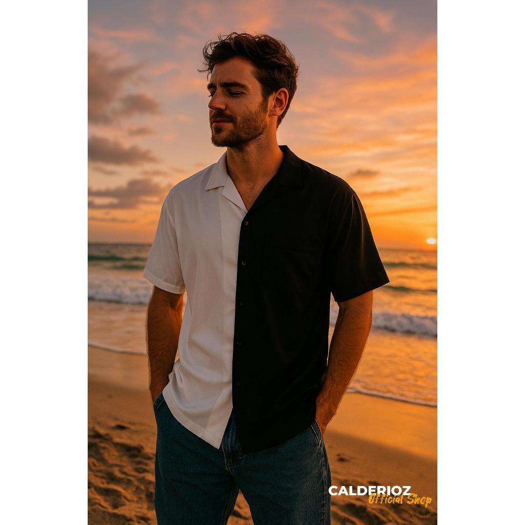 Calderioz - Kemeja Hawai Kombinasi Hitam Putih Pria Wanita Tropis Baju Retro Two Tone Casual