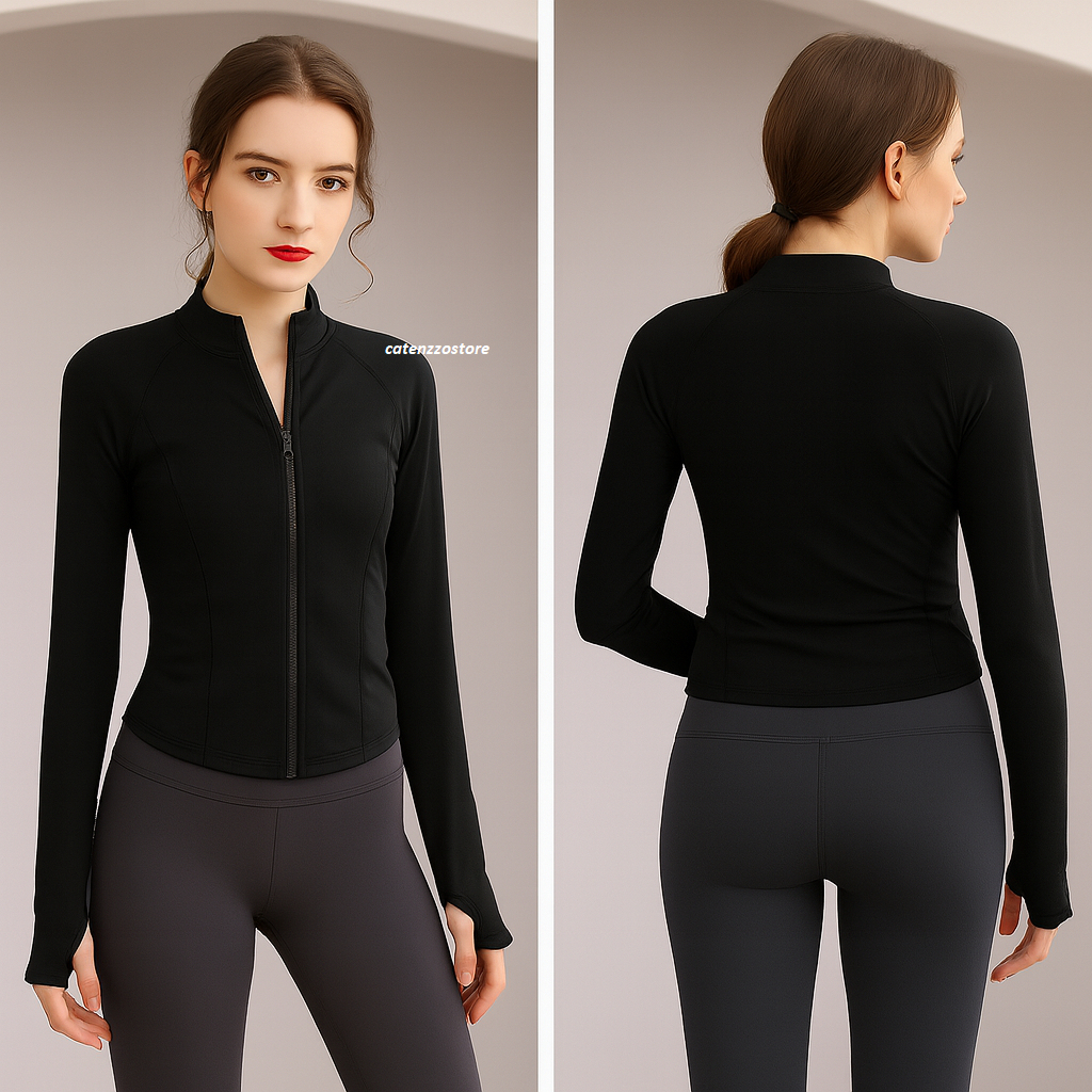 Jaket fitnes wanita Olahraga gym Slimfit Polos Lengan Panjang cepat kering dengan resleting yoga / lari anti uv