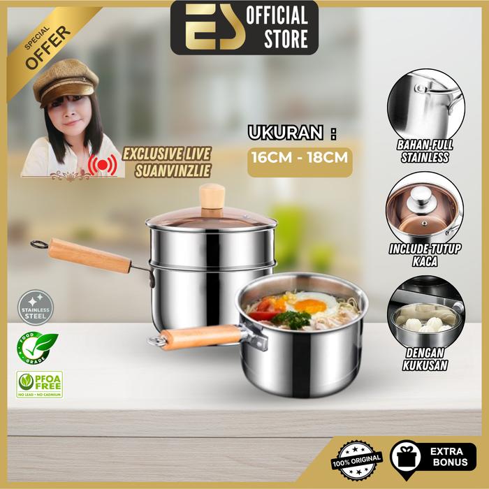 ES x Suanvinzlie Panci Susu Panci Mie Panci Sup Stainless Steel Dengan Kukusan Ukuran 16cm 18cm