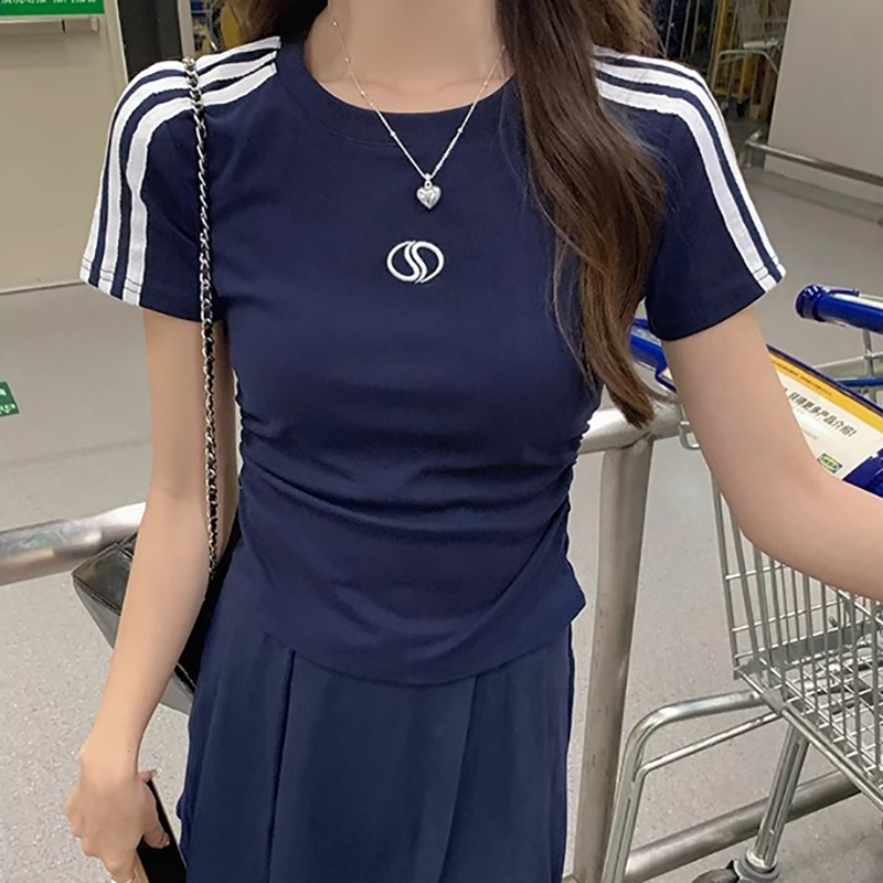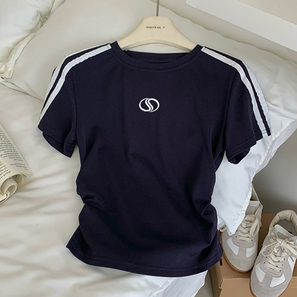 Kaus Lengan Pendek Leher Bulat Bordir Tiga Garis Hitam Baru Atasan Wanita Gaya Korea