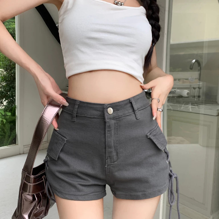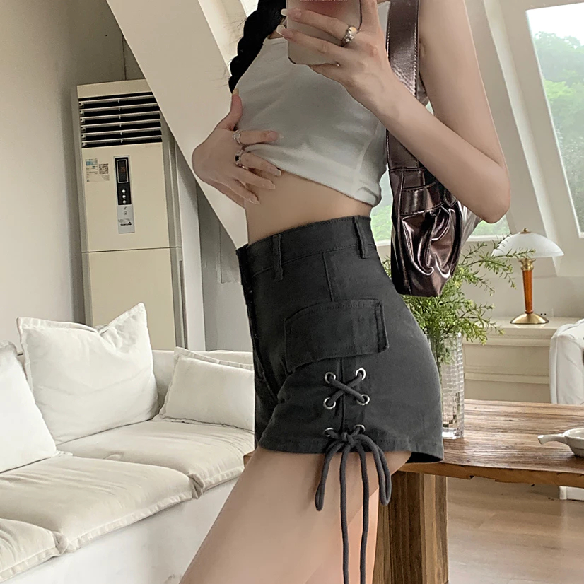 YURUMA Celana Pendek Denim Ramping Pinggang Tinggi Gaya Korea Celana A-line Bertali Gaya Baru